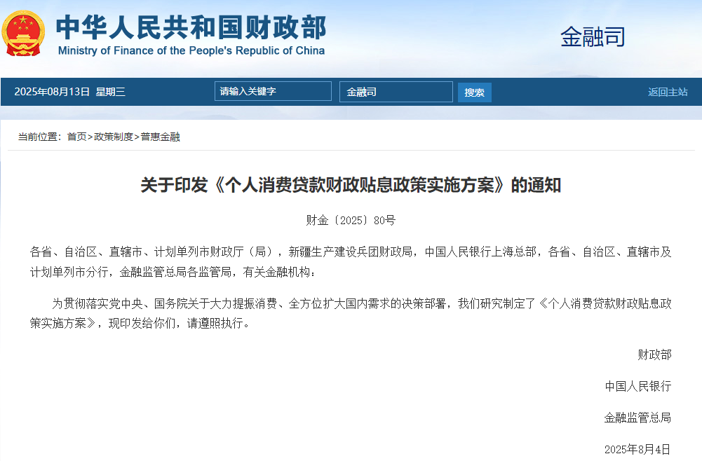 深圳新聞網(wǎng)2025年8月13日訊(記者 湯莎)近日,財政部、中國人民銀行、金融監(jiān)管總局印發(fā)《個人消費貸款財政貼息政策實施方案》(以下簡稱方案),中央及省級財政將對符合條件的個人消費貸款實施貼息。