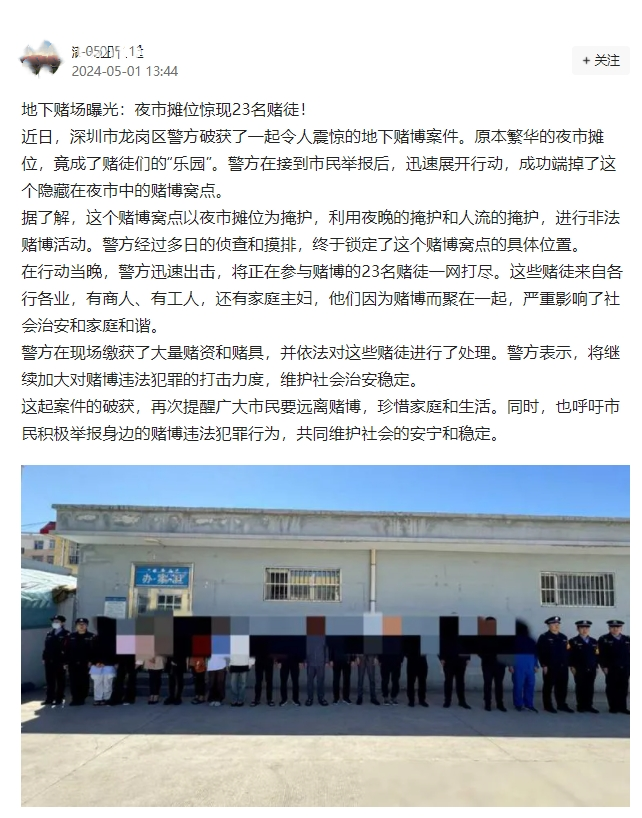 有網(wǎng)民在某社交平臺發(fā)帖稱:“近日,深圳市龍崗區(qū)破獲了一起令人震驚的地下賭博案件。原本繁華的夜市攤位,竟成了賭徒們的‘樂園’?!饼垗弲^(qū)相關(guān)部門第一時間對該內(nèi)容進行核查,確認此消息不實,龍崗區(qū)沒有發(fā)生此類案件。