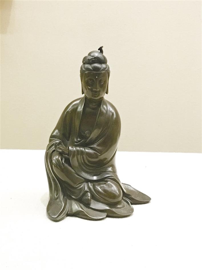 其中,最引人注目的莫過于展覽海報上呈現(xiàn)的“景德鎮(zhèn)白釉瓷塑觀音菩薩像”,產(chǎn)于南宋時期,整尊瓷塑構(gòu)思既簡約又精巧,以粗線條捏塑形體與衣紋,胸前瓔珞精致,人物形象傳神,充分展現(xiàn)了宋代瓷塑藝術(shù)的審美意韻與高超技藝。令人嘖嘖稱贊的還有明中晚期的“銅觀音菩薩像”。此像采用暹羅國(今泰國)所貢優(yōu)質(zhì)風(fēng)磨銅鑄造,工藝精細(xì),撫之如嬰兒肌膚,嵌銀絲,背后銀絲鑲嵌方章銘款“石叟”二字,當(dāng)出自石叟本人之手。據(jù)了解,石叟為明代晚期鑄銅塑像名匠,僧人身份,現(xiàn)存中晚明觀音銅像中尚有部分“石叟”款,真品珍貴稀罕。