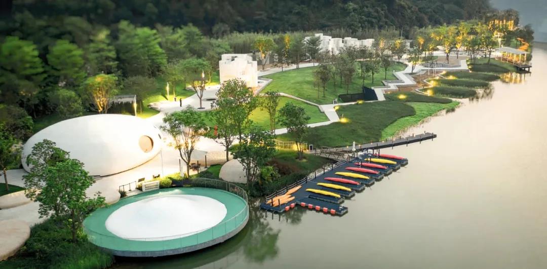 小鎮(zhèn)除規(guī)劃有安藤忠雄禮堂四部曲之一的“詩之禮堂”,還邀請(qǐng)了國(guó)內(nèi)外一眾頂級(jí)設(shè)計(jì)師參與設(shè)計(jì),張?zhí)凭坝^作品——龍骨樂園、WATG作品——棕櫚樹酒店、鄭東賢作品——高街,還有MORSE COFFEE、社交廚房、深夜食堂等配套建筑,實(shí)現(xiàn)居住、休閑、度假、教育、社交和精神文化等空間一體融合,締造了大灣區(qū)首選的深度休閑度假目的地。