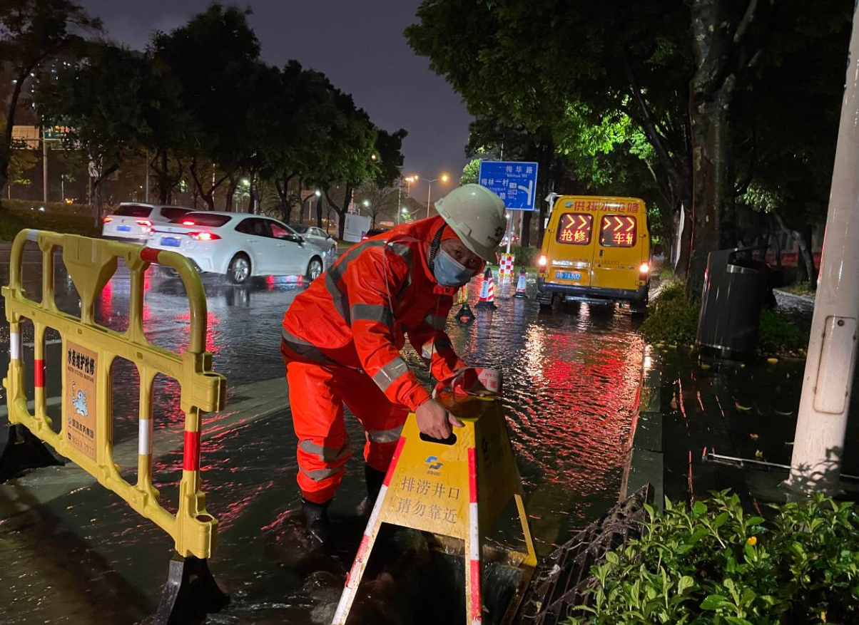 深圳環(huán)水集團(tuán)福田分公司員工堅守在北環(huán)立交梅秀路口易淹點(diǎn),打開雨水篦子加速排水。(深圳新聞網(wǎng)記者 潘潤華 通訊員 陶柳)
