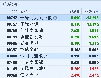 智通財(cái)經(jīng)APP獲悉,多只炒高的光伏股今日顯著回吐,截至11時(shí)53分,卡姆丹克太陽能(00712)跌14.29%,報(bào)價(jià)0.09港元,陽光能源(00757)跌13.39%,報(bào)0.11港元。
