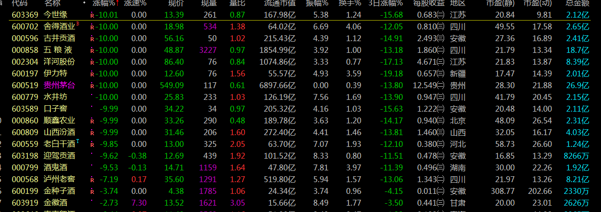 云財經訊,10月29日早間,白酒股集體暴跌,截至發(fā)稿,貴州茅臺(600519)、洋河股份(002304)、口子窖(603589)、順鑫農業(yè)(000860)跌停、五糧液(000858)逼近跌停。據(jù)統(tǒng)計,近5個交易日,A股白酒板塊總市值縮水超3400億元。消息面上,今年貴州茅臺(600519)前三季度的業(yè)績增速有所放緩。公司第三季度的凈利實際同比增長率僅為2.71%。