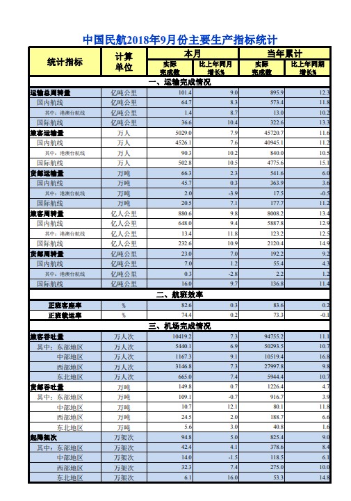 智通財經(jīng)APP獲悉,中國民用航空局今日發(fā)布的主要運輸生產(chǎn)指標統(tǒng)計顯示,今年9月,運輸總周轉(zhuǎn)量達到101.4億噸公里,同比增長9%;中國民航旅客運輸量達到5029萬人,同比增長7.9%,當年累計運輸量已達4.57億人;9月貨郵運輸量為66.3萬噸,同比增長2.3%。