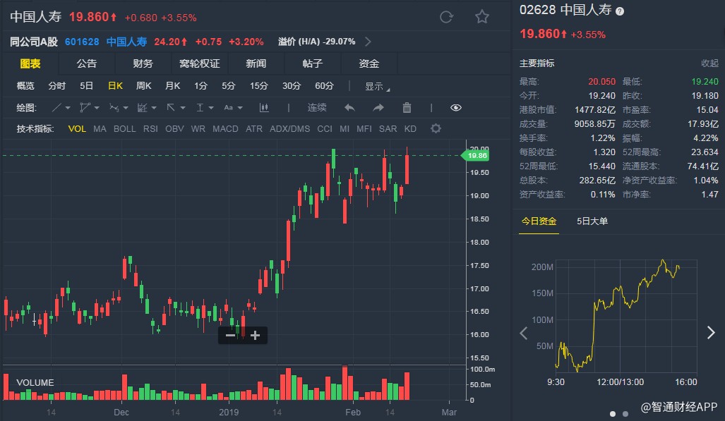 截至發(fā)稿,中國人壽(02628)升3.55%,報19.86港元。(劉大洋)