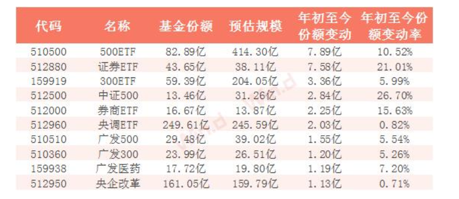 年初至今股票ETF份額增長TOP10:年初至今南方中證500ETF(510500)份額增長了7.89億,增長勢頭最猛。此外,華夏中證500ETF(512500)份額增長2.84億,廣發(fā)中證500ETF(510510)份額增長1.55億。