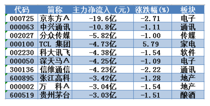 周三兩市主力資金凈流入(出)前10只個(gè)股: