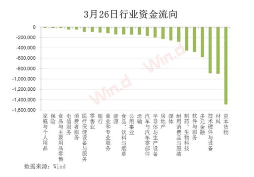 3月26日行業(yè)主力資金流向來(lái)看,所有行業(yè)均出現(xiàn)凈流出,累計(jì)凈流出逾700億元。其中,資本貨物流出最多,超過(guò)140億元;材料、技術(shù)硬件與設(shè)備、多元金融板塊凈流出均超過(guò)50億元。