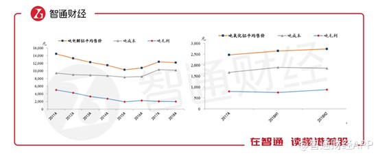 二是因為其產(chǎn)品噸成本居高不下,拿電解鋁來說,2015年之前,隨著售價的明顯下降,噸成本卻保持穩(wěn)定,導(dǎo)致利潤空間被壓縮。新生產(chǎn)品氧化鋁毛利率目前還比較穩(wěn)定,并且高于電解鋁的毛利率。這可能也是氧化鋁業(yè)務(wù)占比迅速擴大的原因。