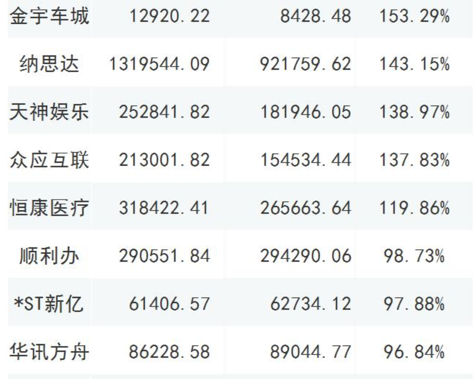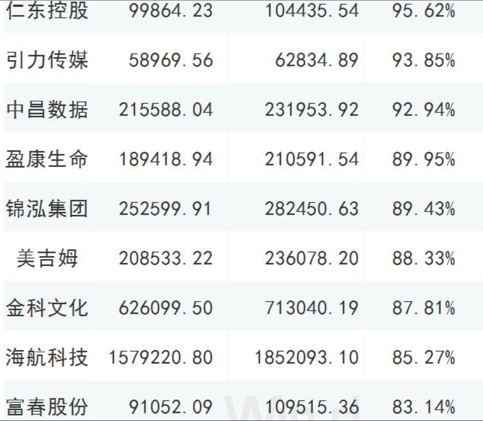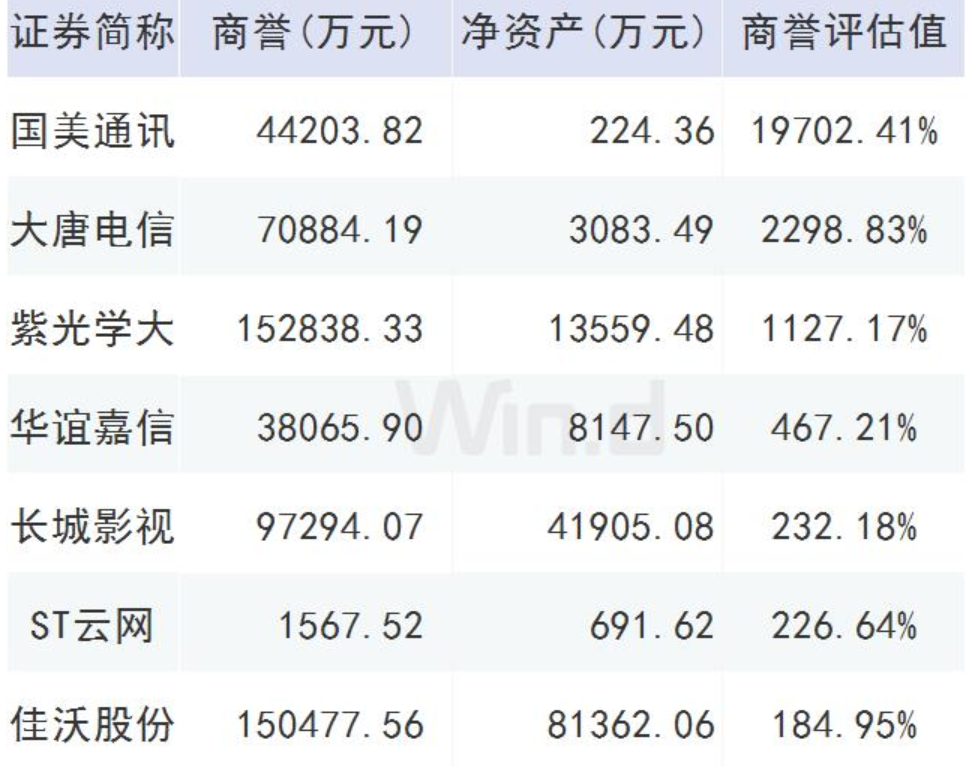 截至2019年三季報商譽占凈資產(chǎn)比重大于70%的公司,共有46家;12家的比值超過了百分百,以下列舉部分超過80%的公司;謹慎年終商譽減值風險爆發(fā);