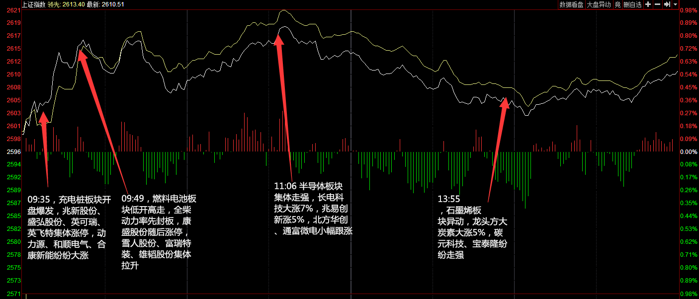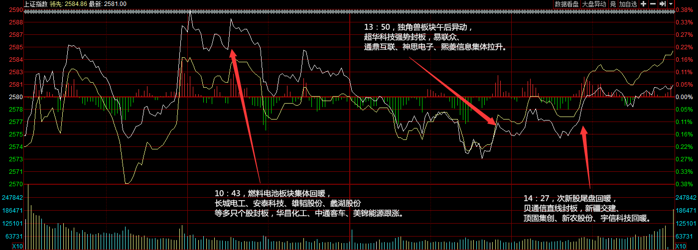指數(shù)今日小幅低開,開盤后不久在燃料電池、汽車等板塊的帶領下,三大指數(shù)積極上攻一度翻紅,但做多動能未能持續(xù)沖高回落。午后指數(shù)弱勢盤整,創(chuàng)投、次新股輪番拉升,但未改兩市橫盤局面。個股漲跌參半。