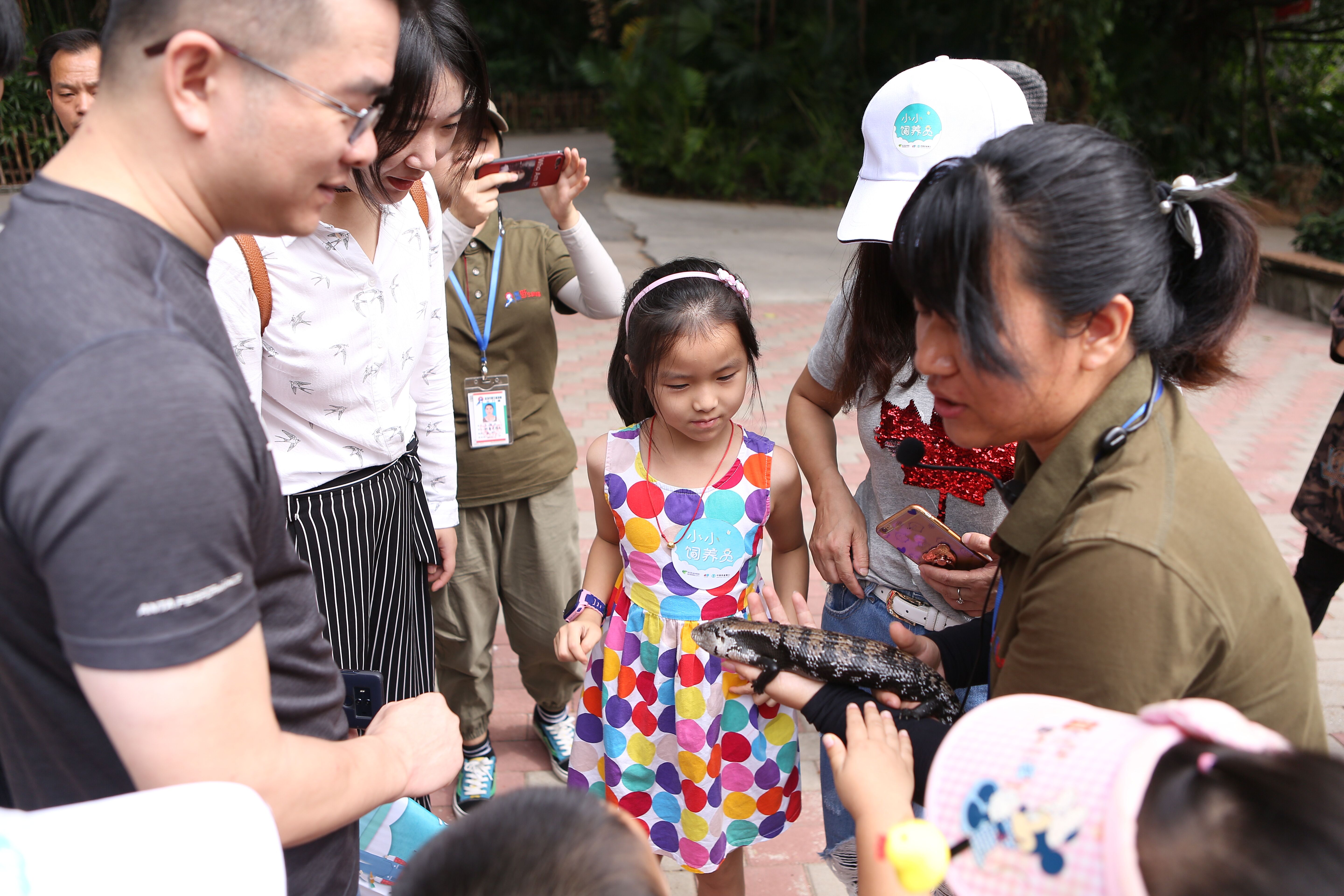 “鬃獅蜥和藍舌石龍子都是蜥蜴的一種。當(dāng)遭受威脅時,鬃獅蜥會張開嘴及將帶刺的咽喉膨起來像一頭生氣的獅子。藍舌石龍子的舌頭是藍色的,平時會不時向外一伸一伸?!毙∨笥褌冋J(rèn)真地聽科普導(dǎo)游講解兩種蜥蜴的區(qū)別,膽大的孩子則抱起蜥蜴仔細(xì)觀察起來。