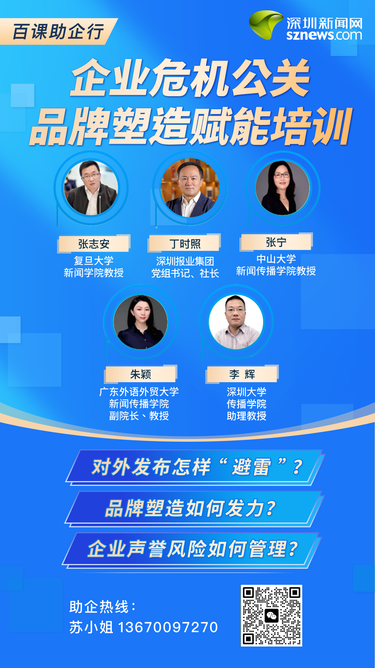 深圳新聞網(wǎng)以長(zhǎng)期輿論研究及智庫(kù)服務(wù)經(jīng)驗(yàn)為支撐,不斷充實(shí)師資庫(kù)、豐富課程體系。目前,智庫(kù)團(tuán)隊(duì)包括復(fù)旦大學(xué)新聞學(xué)院教授張志安,深圳報(bào)業(yè)集團(tuán)黨組書記、社長(zhǎng)丁時(shí)照,中國(guó)青年報(bào)編委曹林,中山大學(xué)新聞傳播學(xué)院教授張寧,廣東外語(yǔ)外貿(mào)大學(xué)新聞傳播學(xué)院副院長(zhǎng)、教授朱穎,深圳大學(xué)傳播學(xué)院助理教授李輝等近百位來自公共關(guān)系、新聞傳播領(lǐng)域?qū)<摇?/p>