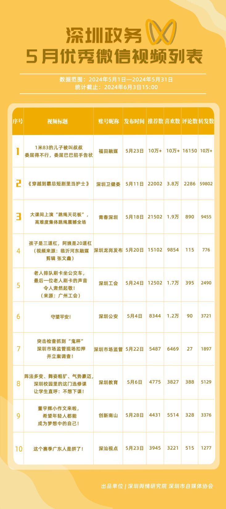 5月,“深圳衛(wèi)健委”“深圳龍崗發(fā)布”“i深圳”“幸福福田”“深圳交通”“深圳工會(huì)”“青春深圳”“羅湖發(fā)布”“深圳應(yīng)急管理”“深圳教育”等30個(gè)政務(wù)微信公眾號(hào),被評(píng)為“深圳優(yōu)秀政務(wù)微信公眾號(hào)”。5月,“深圳衛(wèi)健委”憑借精心創(chuàng)作的內(nèi)容、與受眾深入互動(dòng),多篇作品深受好評(píng),榮登榜單首位。“深圳龍崗發(fā)布”“i深圳”“幸福福田”“深圳交通”等上榜公眾號(hào)也積極捕捉觀眾優(yōu)質(zhì)作品需求,把握主流熱點(diǎn)趨勢(shì),集中發(fā)揮政務(wù)媒體傳播力量,在本期也取得了較為亮眼的成績(jī),進(jìn)一步推動(dòng)了政務(wù)信息傳播工作提質(zhì)增效。
