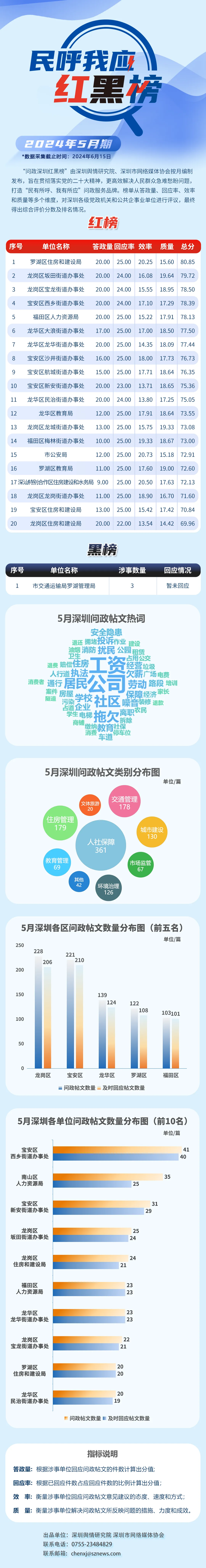 2024年5月,共有20家單位因積極解決民生問題,認(rèn)真細(xì)致答政,登上“紅榜”,它們分別是:羅湖區(qū)住房和建設(shè)局、龍崗區(qū)坂田街道辦事處、龍崗區(qū)寶龍街道辦事處、寶安區(qū)西鄉(xiāng)街道辦事處、福田區(qū)人力資源局、龍華區(qū)大浪街道辦事處、龍華區(qū)龍華街道辦事處、寶安區(qū)沙井街道辦事處、寶安區(qū)航城街道辦事處、寶安區(qū)新安街道辦事處、龍華區(qū)民治街道辦事處、龍華區(qū)教育局、龍崗區(qū)龍城街道辦事處、福田區(qū)梅林街道辦事處、市公安局、羅湖區(qū)教育局、深汕特別合作區(qū)住房建設(shè)和水務(wù)局、龍崗區(qū)龍崗街道辦事處、寶安區(qū)住房和建設(shè)局、龍崗區(qū)住房和建設(shè)局。另外,市交通運輸局羅湖管理局因相關(guān)帖文回應(yīng)率偏低,整體答政效果不佳,被列入“黑榜”。