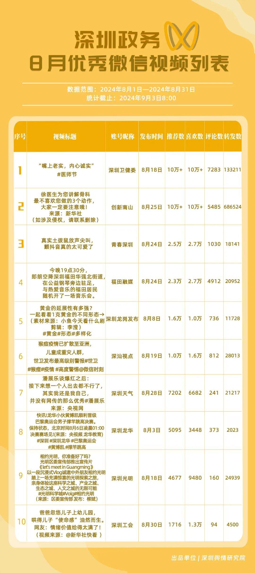 8月,獲“深圳優(yōu)秀政務(wù)微信視頻號(hào)”稱號(hào)的分別是“創(chuàng)新南山”“深圳衛(wèi)健委”“福田融媒”“深汕視點(diǎn)”“深圳龍崗發(fā)布”“青春深圳”“深圳天氣”“深圳光明”“深圳工會(huì)”和“深圳公安”。微信視頻號(hào)方面,多賬號(hào)以原創(chuàng)內(nèi)容吸引了大量關(guān)注,如“郎朗空降深圳華強(qiáng)北”“深圳坪山長(zhǎng)守戲劇谷”等,展示了深圳的文化魅力和城市活力,也有賬號(hào)轉(zhuǎn)載網(wǎng)絡(luò)熱門視頻,以其實(shí)用性、趣味性獲得了網(wǎng)民的推薦和點(diǎn)贊。