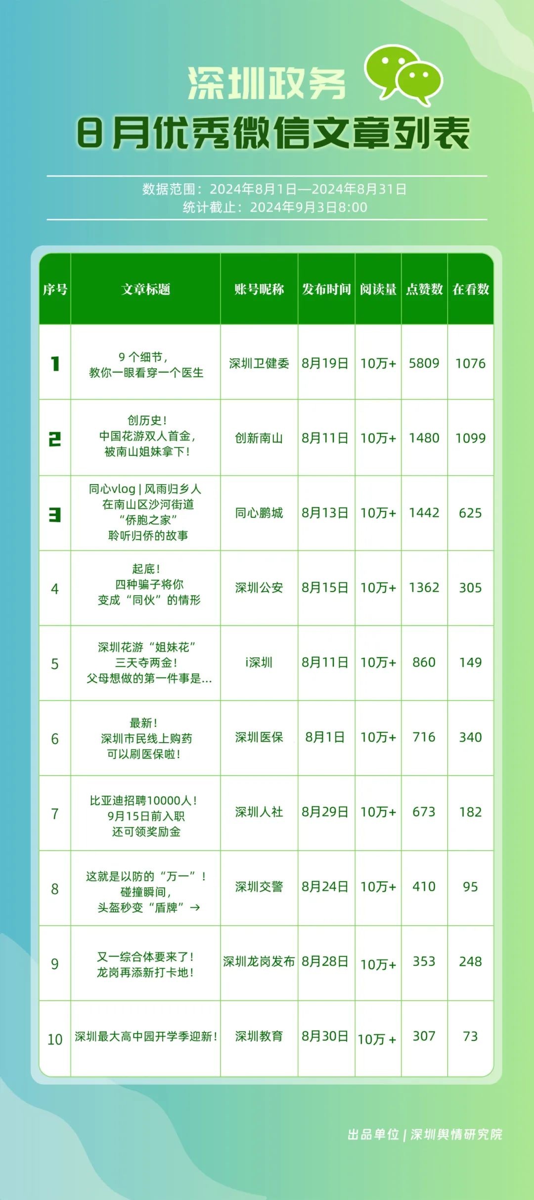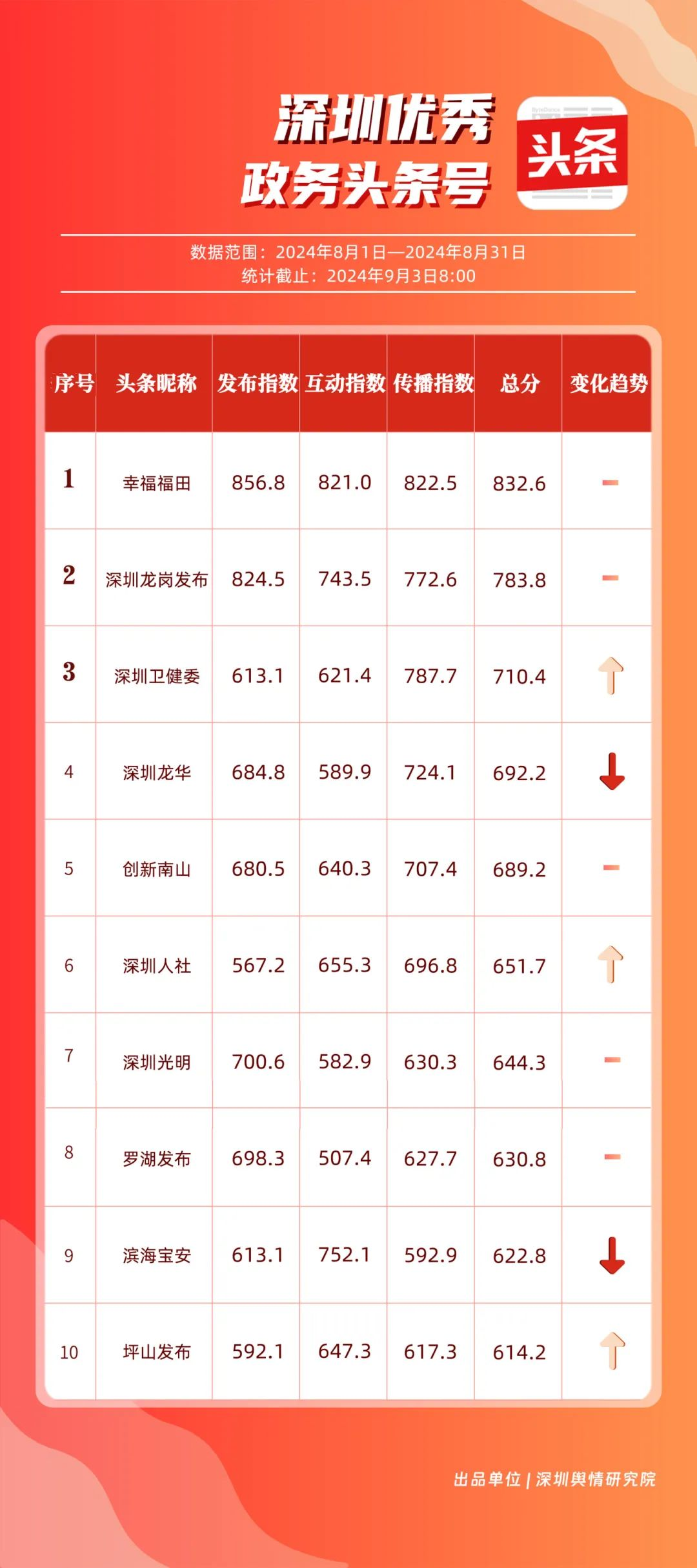 8月,“幸福福田”“深圳龍崗發(fā)布”“深圳衛(wèi)健委”“深圳龍華”“創(chuàng)新南山”“深圳人社”“深圳光明”“羅湖發(fā)布”“濱海寶安”和“坪山發(fā)布”共10個(gè)政務(wù)頭條號(hào)入選榜單。相關(guān)賬號(hào)的文章《“為愛瘋狂,怎么3天后‘下面’喜提美乃滋?”》《最新消息!價(jià)格即將調(diào)整!時(shí)間就在→》等貼近民生,傳遞實(shí)用信息,收獲了較高的閱讀量和點(diǎn)贊數(shù)。
