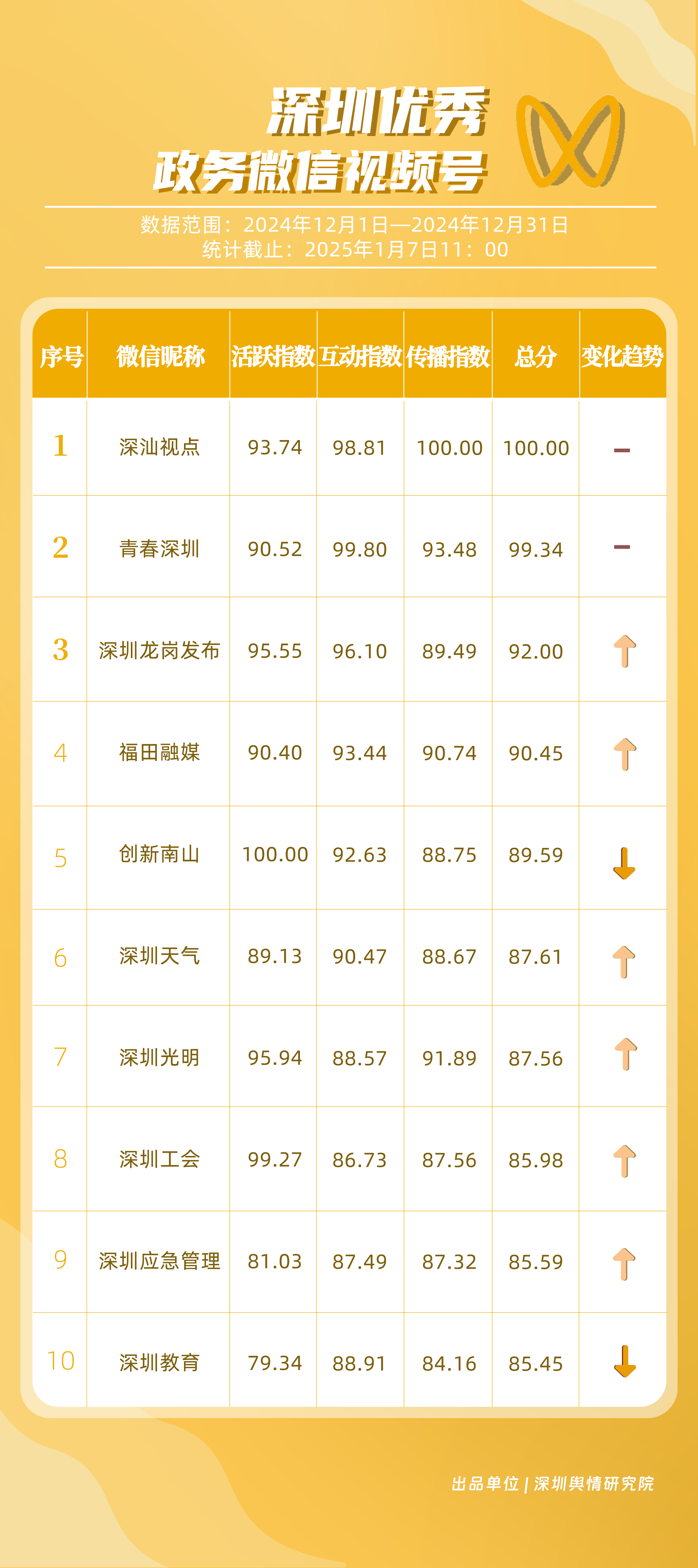 12月,獲“深圳優(yōu)秀政務(wù)微信視頻號”稱號的分別是“深汕視點”“青春深圳”“深圳龍崗發(fā)布”“福田融媒”“創(chuàng)新南山”“深圳天氣”“深圳光明”“深圳工會”“深圳應(yīng)急管理”“深圳教育”。其中,“深汕視點”“青春深圳”在互動方面表現(xiàn)突出,占據(jù)榜單第一、第二位置?!吧钲邶垗彴l(fā)布”活躍、互動指數(shù)位于各政務(wù)視頻號前列,排名有所提升?!案L锶诿健比笾笜?biāo)得分均在90分以上,位于榜單第四名,充分展現(xiàn)各政務(wù)微信視頻號在信息更新、用戶互動以及傳播范圍等方面的卓越能力和持續(xù)進步。