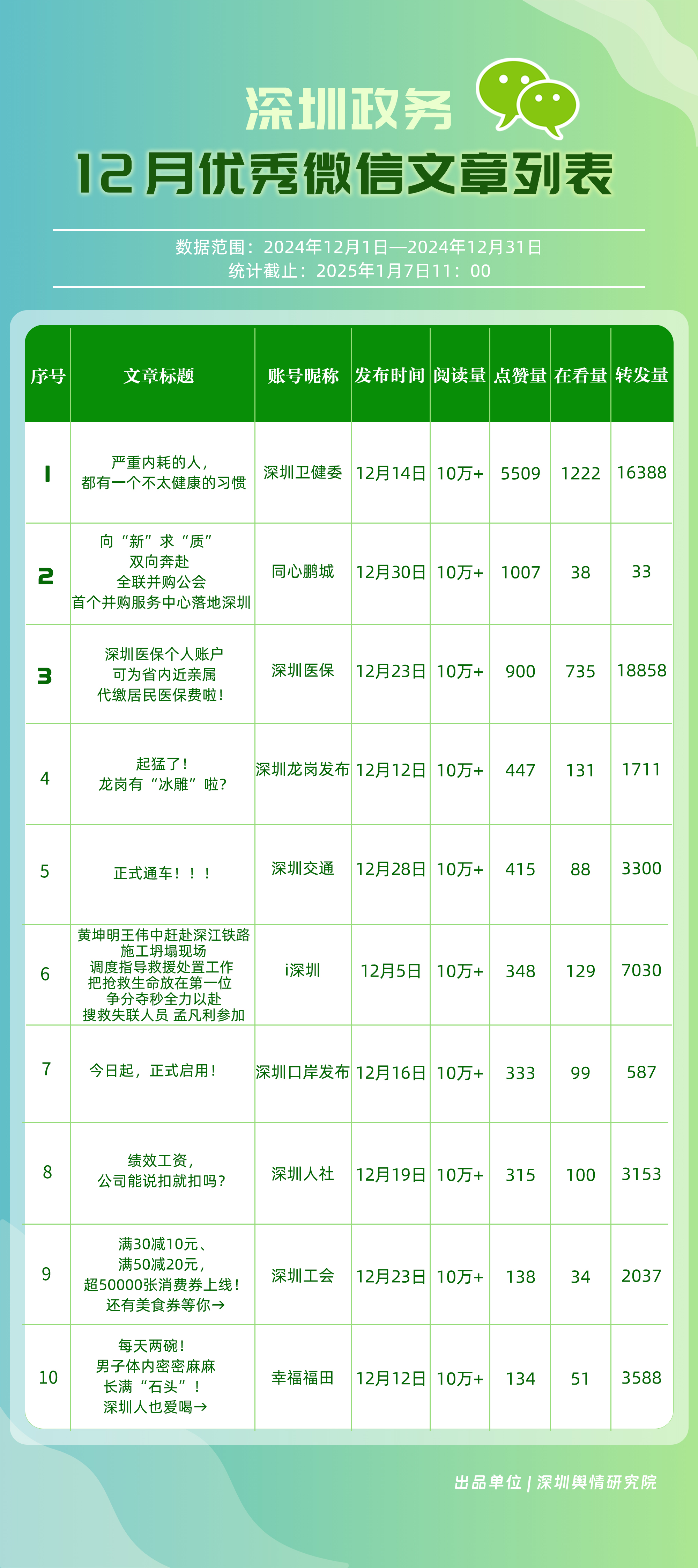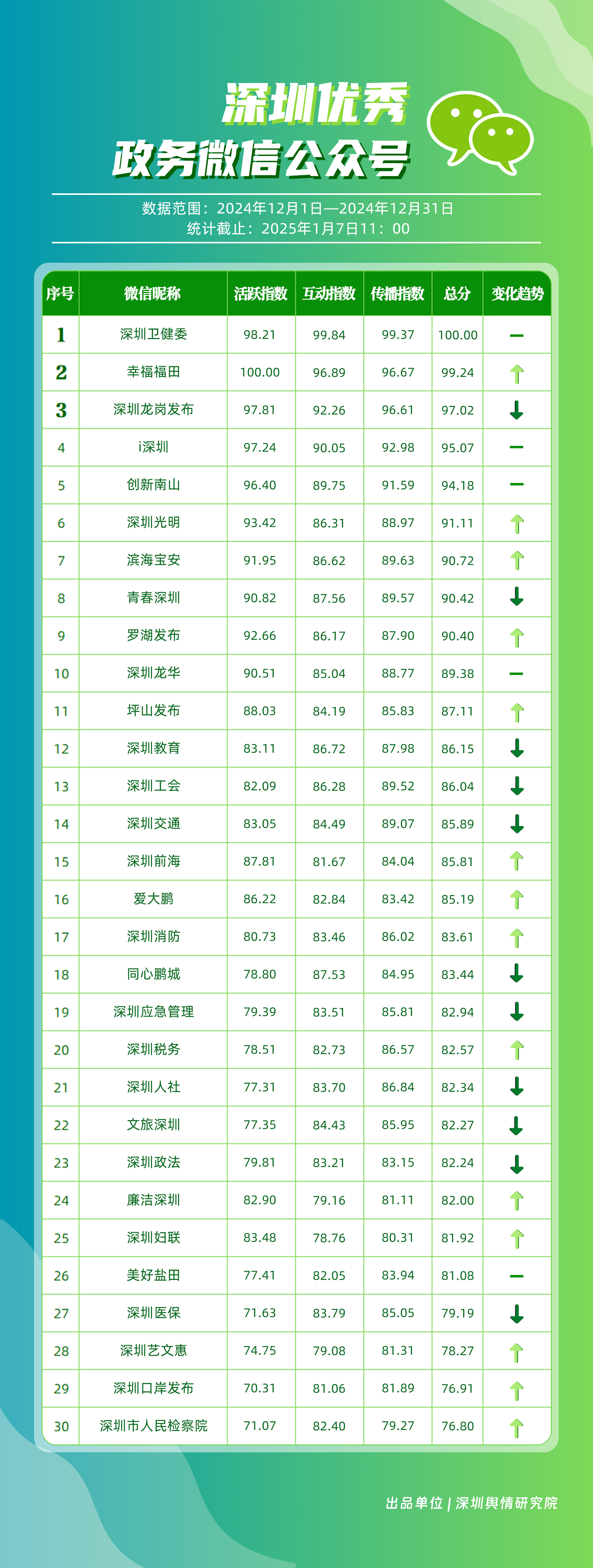 12月,“深圳衛(wèi)健委”“幸福福田”“深圳龍崗發(fā)布”“i深圳”“創(chuàng)新南山”“深圳光明”“濱海寶安”“青春深圳”“羅湖發(fā)布”“深圳龍華”等30個賬號入選“深圳優(yōu)秀政務(wù)微信公眾號”。其中,“深圳衛(wèi)健委”位于榜單首位,總分為100分。“幸福福田”“深圳光明”“濱海寶安”“羅湖發(fā)布”排名在本期有所提升,展現(xiàn)了他們不斷提升的傳播力、影響力?!癷深圳”“創(chuàng)新南山”則保持了穩(wěn)定的排名,持續(xù)在政務(wù)信息宣傳中發(fā)揮著重要作用。