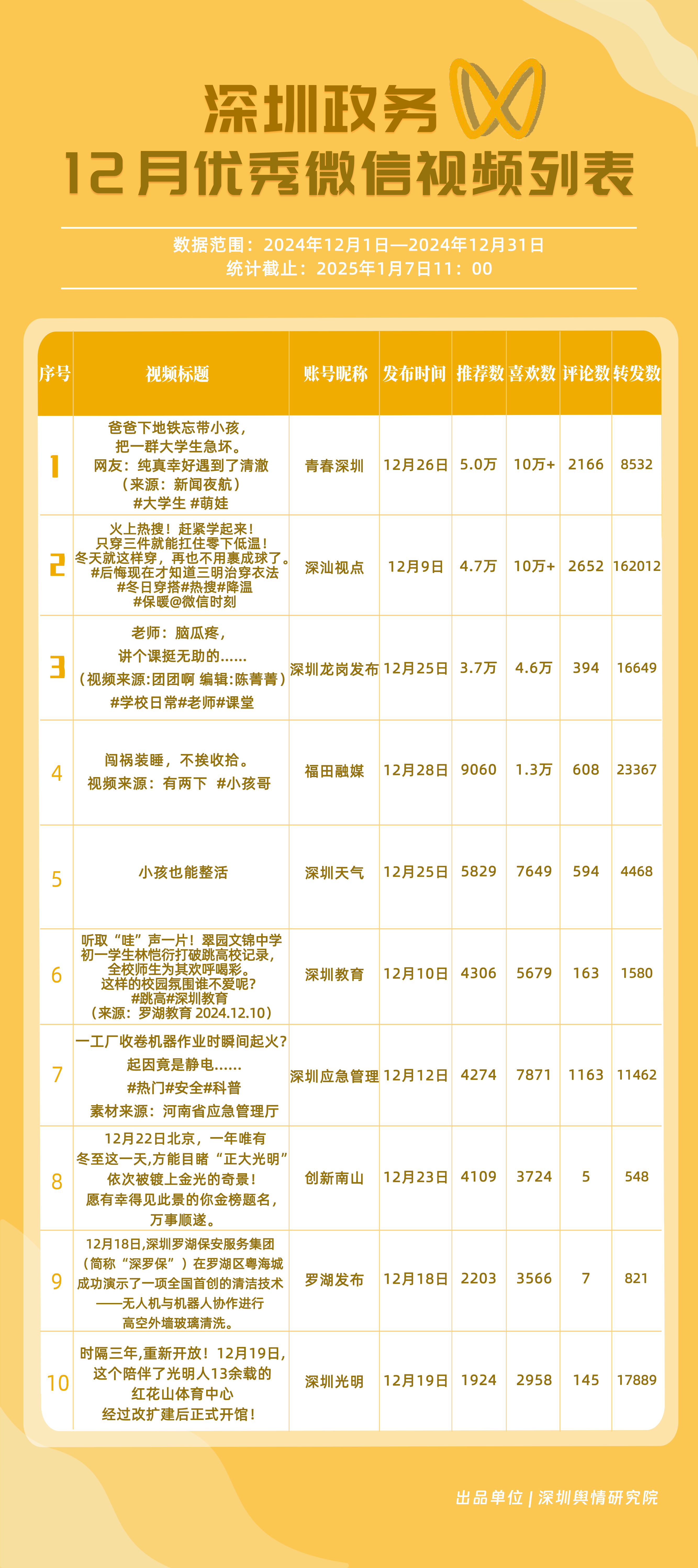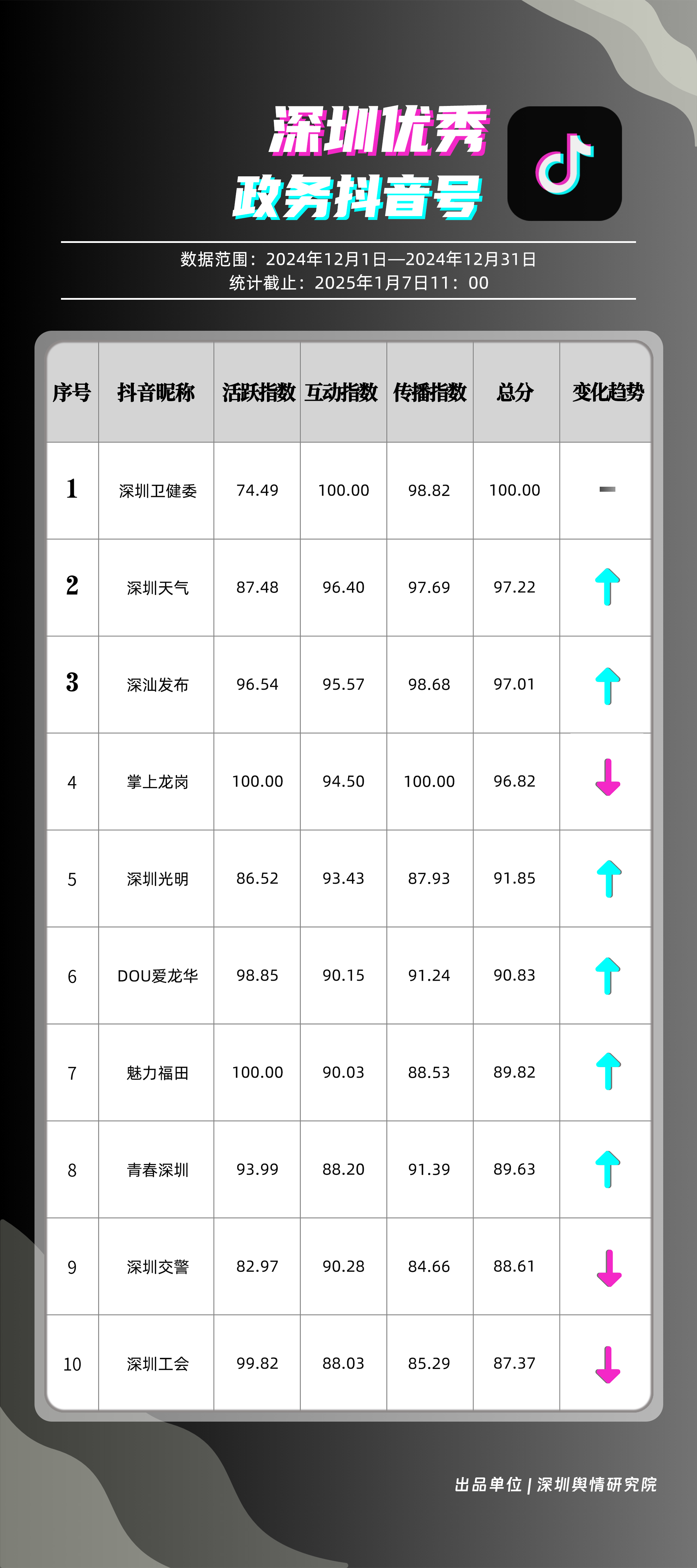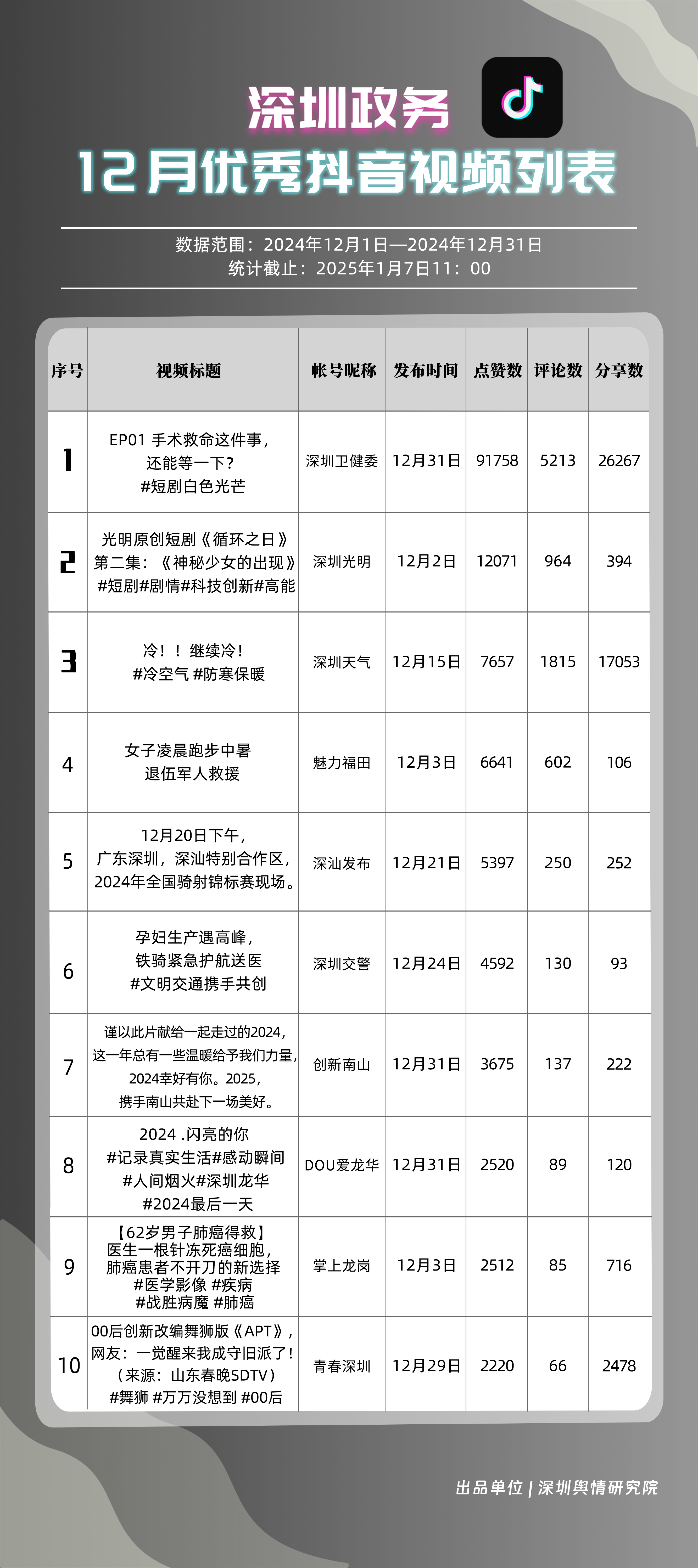 12月,“深圳衛(wèi)健委”“深圳天氣”“深汕發(fā)布”“掌上龍崗”“深圳光明”“DOU愛龍華”“魅力福田”“青春深圳”“深圳交警”“深圳工會”共10個政務(wù)抖音號獲得“深圳優(yōu)秀政務(wù)抖音號”稱號。“深圳衛(wèi)健委”在互動、傳播方面成績優(yōu)異,助推其位于榜單首位?!吧钲谔鞖狻薄吧钌前l(fā)布”“掌上龍崗”則各有所長,綜合排名位于榜單前列,內(nèi)容產(chǎn)出豐富、用戶互動高頻,信息傳播廣泛,共同展現(xiàn)了政務(wù)抖音號在服務(wù)公眾、提升信息傳播效能方面的顯著效能。