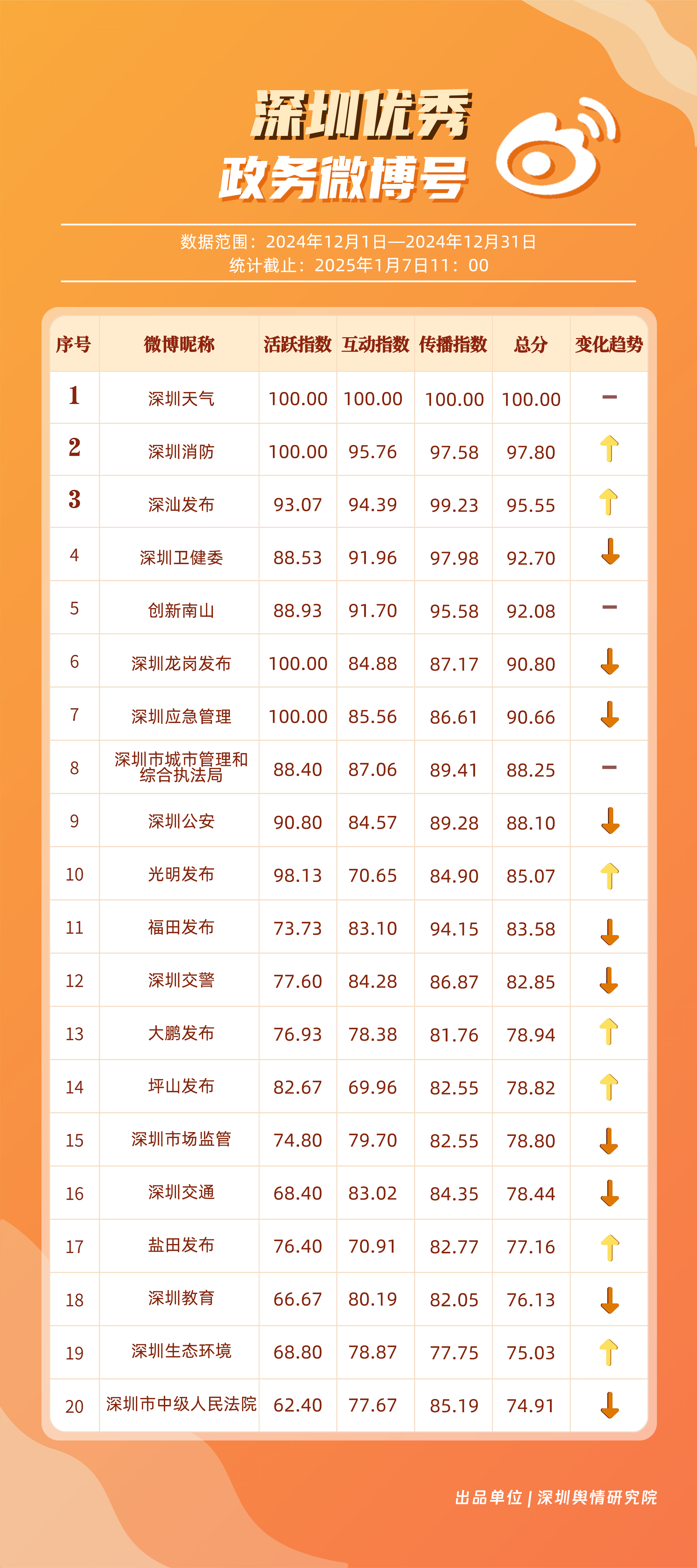 12月,“深圳天氣”“深圳消防”“深汕發(fā)布”“深圳衛(wèi)健委”“創(chuàng)新南山”“深圳龍崗發(fā)布”“深圳應(yīng)急管理”“深圳市城市管理和綜合執(zhí)法局”“深圳公安”“光明發(fā)布”等20個賬號入選“優(yōu)秀政務(wù)微博號”?!吧钲谔鞖狻鲍@得滿分,“深圳消防”“深汕發(fā)布”賬號總分均超95分,位于榜單前三名。同時,“深圳衛(wèi)健委”“創(chuàng)新南山”“深圳龍崗發(fā)布”及“深圳應(yīng)急管理”等賬號憑借對熱點的敏銳捕捉與信息的及時發(fā)布,總分在90分以上,體現(xiàn)出各自在提升公眾信息獲取質(zhì)量方面的不懈努力,彰顯了政務(wù)微博賬號在政民連接、信息共享等方面的巨大價值。