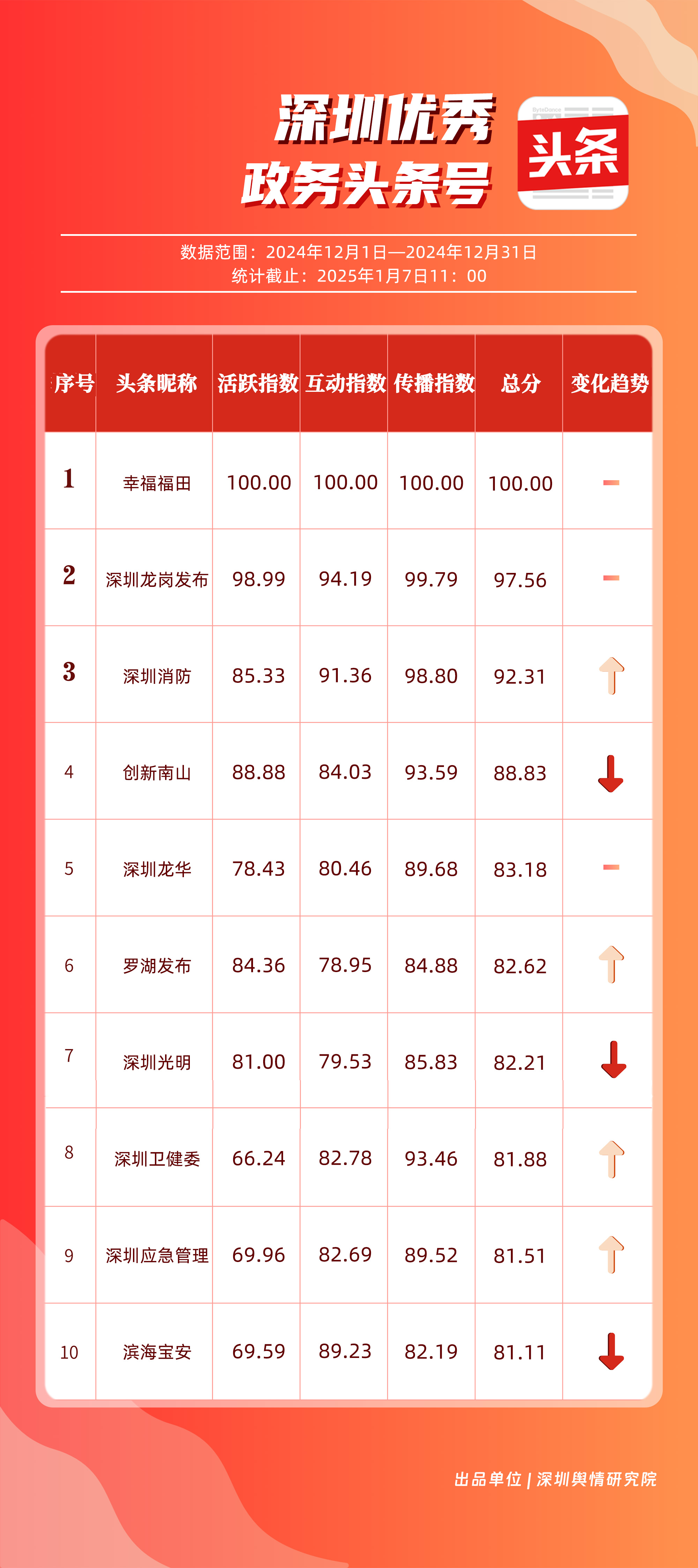 12月,“幸福福田”“深圳龍崗發(fā)布”“深圳消防”“創(chuàng)新南山”“深圳龍華”“羅湖發(fā)布”“深圳光明”“深圳衛(wèi)健委”“深圳應(yīng)急管理”“濱海寶安”共10個政務(wù)頭條號入選“優(yōu)秀政務(wù)頭條號”榜單。對比其他賬號,“幸福福田”在各方面均取得較好成績,居于榜單第一位置?!吧钲邶垗彴l(fā)布”以97.56分位于榜單第二名,其傳播指數(shù)得分為99.79分,反映出賬號在信息傳播范圍方面存在明顯優(yōu)勢。此外,賬號“深圳消防”“創(chuàng)新南山”“深圳龍華”也為市民提供便捷、高效的政務(wù)信息,位于榜單前五名。