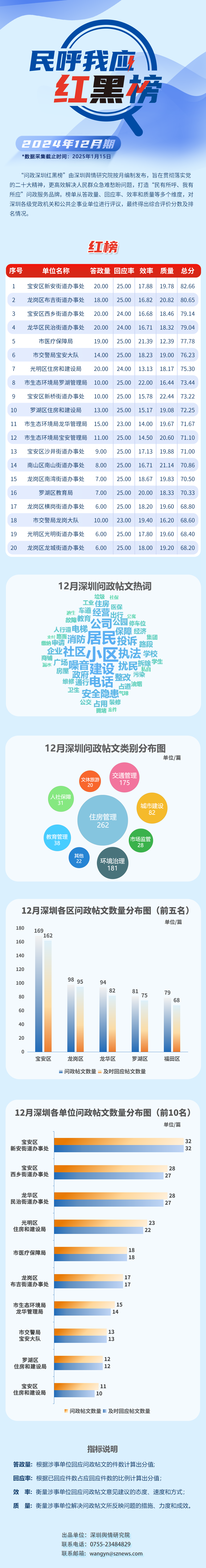 本期榜單采集的帖文主要來(lái)自深圳市及各區(qū)政府官網(wǎng)、深圳論壇、人民網(wǎng)領(lǐng)導(dǎo)留言板、深圳新聞網(wǎng)“民呼我應(yīng)”等平臺(tái),所采集帖文發(fā)布時(shí)間為2024年12月1日至12月31日,采集截止時(shí)間為2025年1月15日。