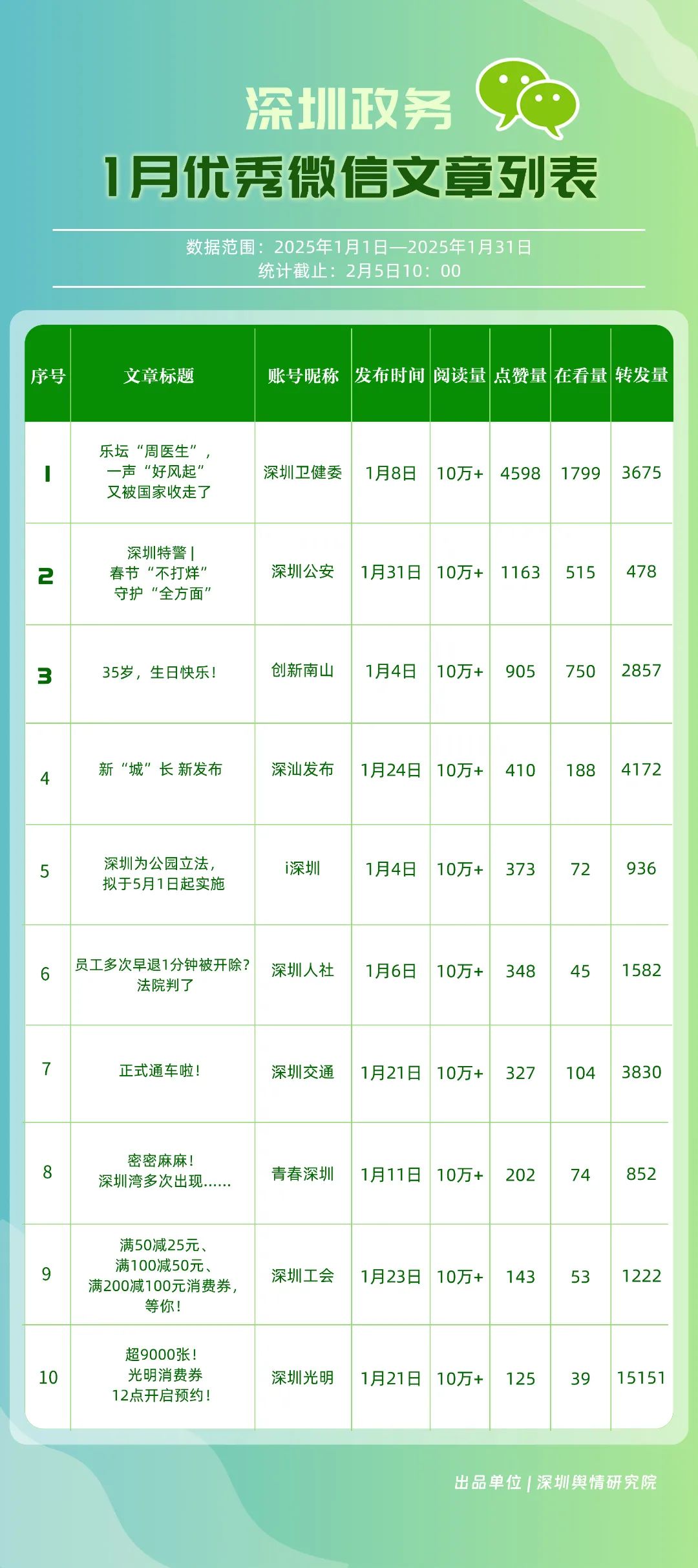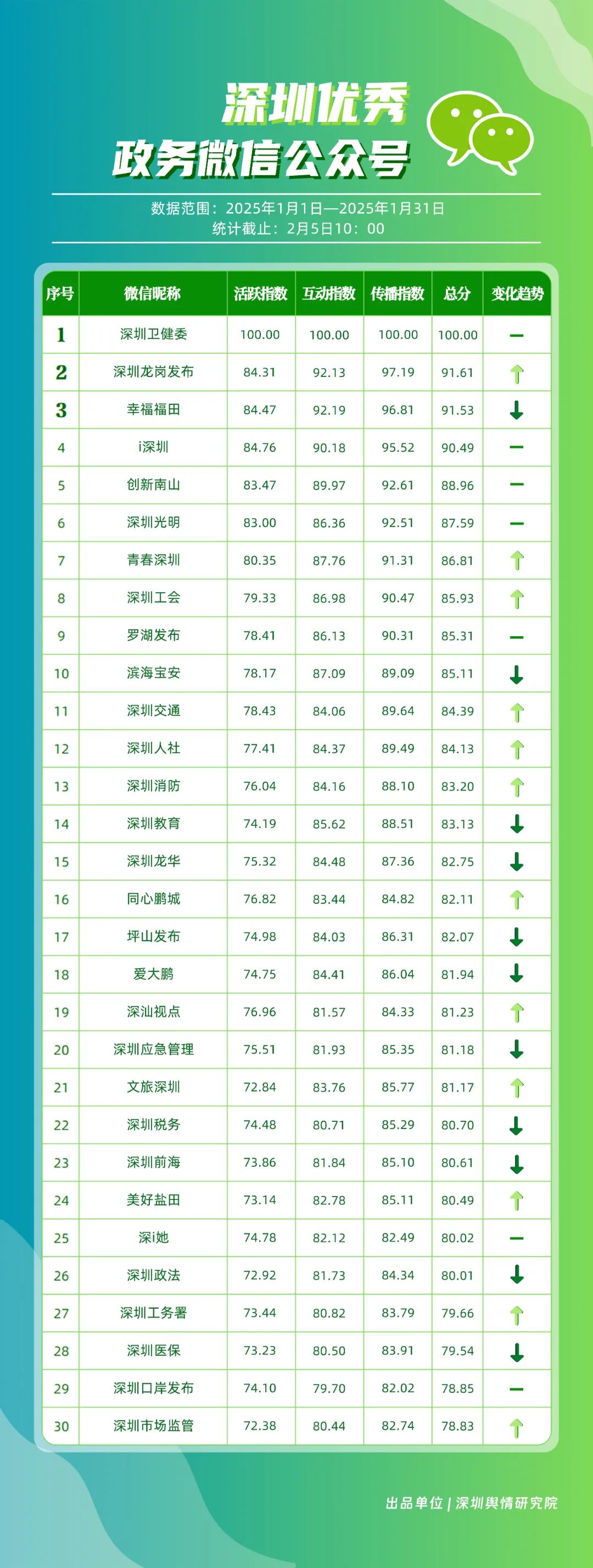 1月,“深圳衛(wèi)健委”“深圳龍崗發(fā)布”“幸福福田”“i深圳”“創(chuàng)新南山”“深圳光明”“青春深圳”“深圳工會(huì)”“羅湖發(fā)布”“濱海寶安”等30個(gè)賬號入選“深圳優(yōu)秀政務(wù)微信公眾號”。其中,“深圳衛(wèi)健委”各方面表現(xiàn)卓越,位于榜單首位,獲得總分100分?!吧钲邶垗彴l(fā)布”“青春深圳”“深圳工會(huì)”排名在本期有所提升,反映了這些賬號在內(nèi)容創(chuàng)新與受眾互動(dòng)方面的不懈努力?!癷深圳”“創(chuàng)新南山”“深圳光明”“羅湖發(fā)布”則保持了穩(wěn)健的排名,持續(xù)在政務(wù)信息的傳播中扮演著不可或缺的角色。