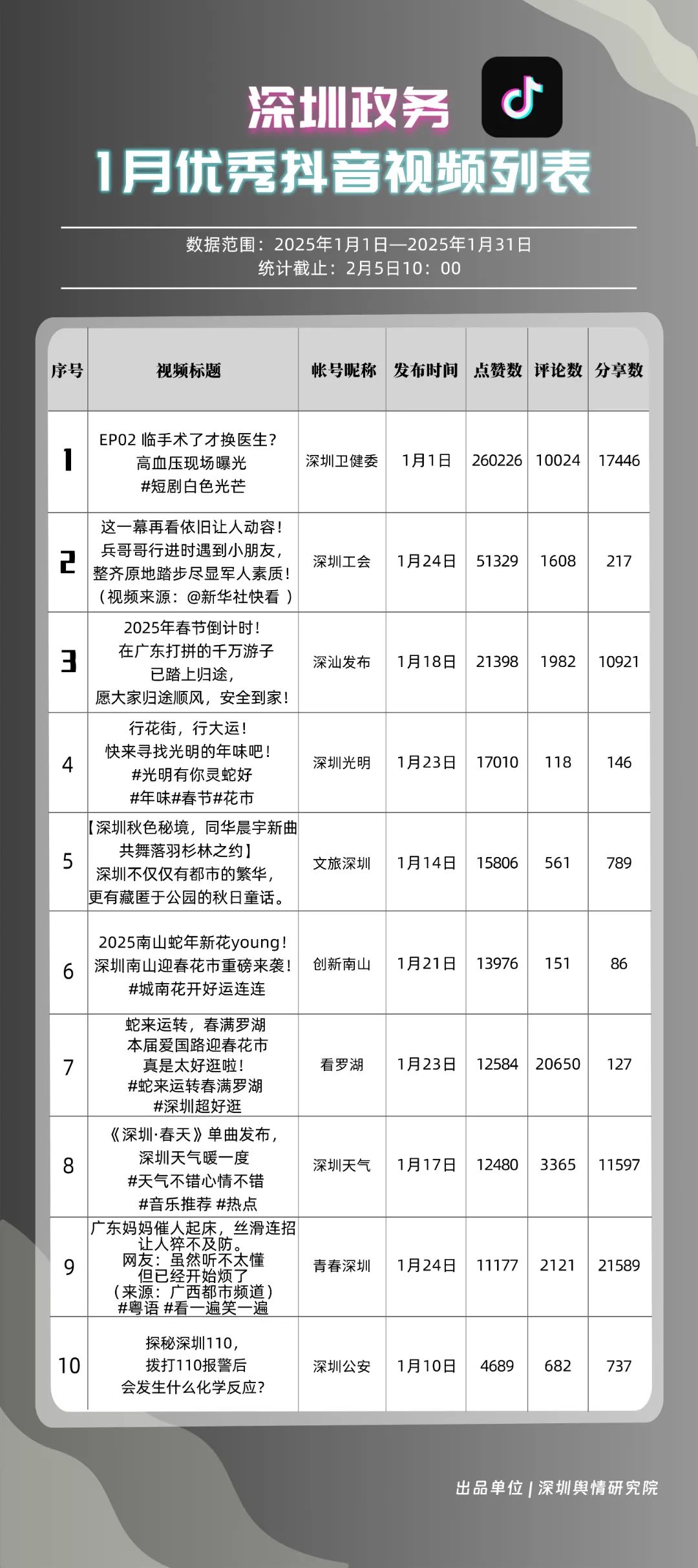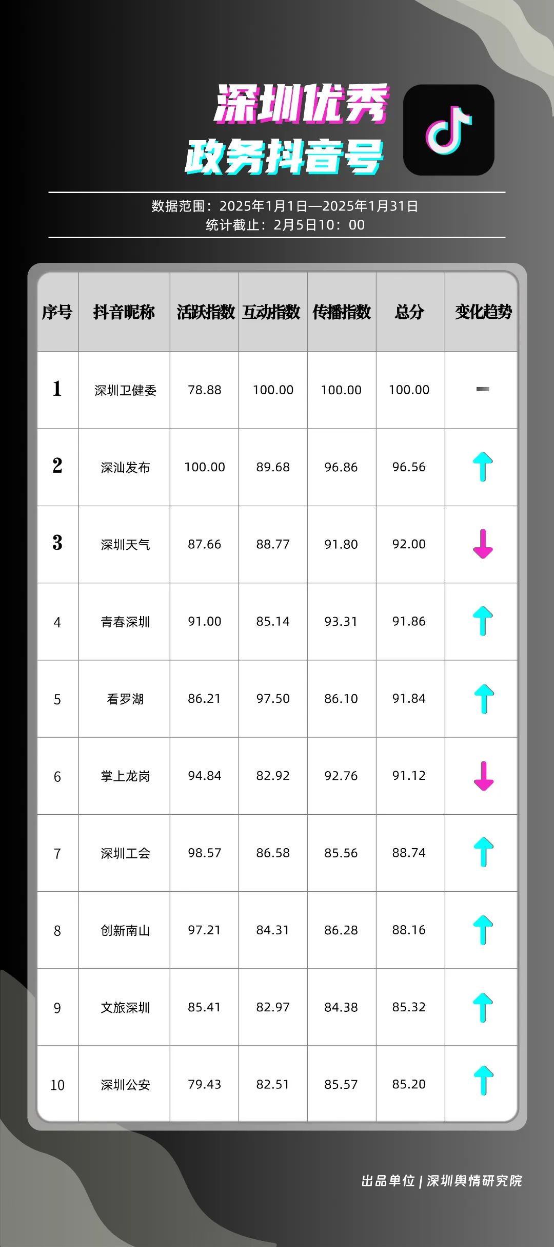 1月,“深圳衛(wèi)健委”“深汕發(fā)布”“深圳天氣”“青春深圳”“看羅湖”“掌上龍崗”“深圳工會(huì)”“創(chuàng)新南山”“文旅深圳”“深圳公安”共10個(gè)政務(wù)抖音號獲得“深圳優(yōu)秀政務(wù)抖音號”稱號。“深圳衛(wèi)健委”“深汕發(fā)布”“深圳天氣”成績優(yōu)異,綜合實(shí)力較強(qiáng),位于榜單前列?!扒啻荷钲凇薄翱戳_湖”等賬號排名有所提升,彰顯了這些賬號在拓寬受眾基礎(chǔ)、增強(qiáng)用戶黏性等方面所取得的積極成效。