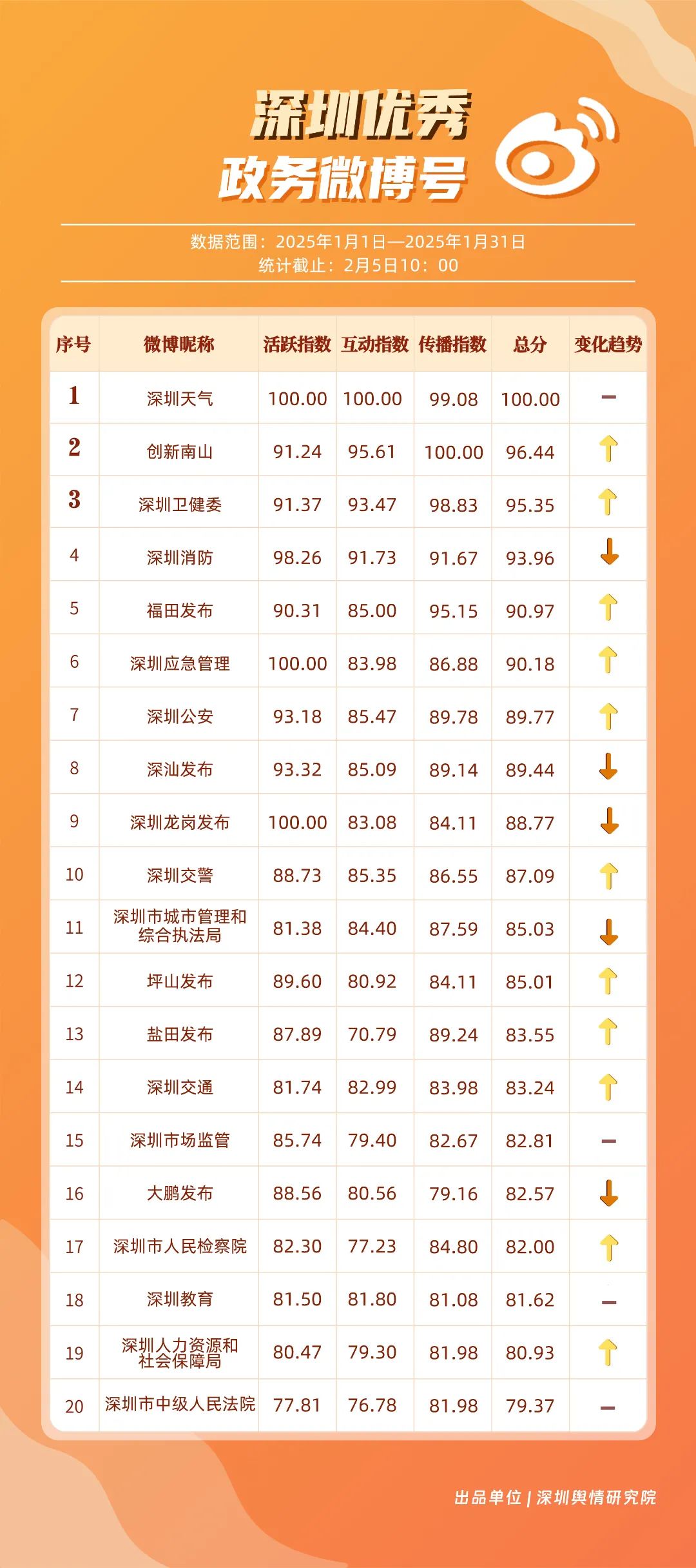 1月,“深圳天氣”“創(chuàng)新南山”“深圳衛(wèi)健委”“深圳消防”“福田發(fā)布”“深圳應(yīng)急管理”“深圳公安”“深汕發(fā)布”“深圳龍崗發(fā)布”“深圳交警”等20個(gè)賬號入選“優(yōu)秀政務(wù)微博號”?!吧钲谔鞖狻睉{借高活躍度、互動(dòng)量等獲得滿分,“創(chuàng)新南山”“深圳衛(wèi)健委”賬號則在1月發(fā)力宣傳,排名上升至榜單第二、三位。同時(shí),“深圳消防”“福田發(fā)布”“深圳應(yīng)急管理”賬號總分在90分以上,彰顯了他們在提升公眾安全意識、促進(jìn)政民互動(dòng)等方面所做出的積極貢獻(xiàn)。