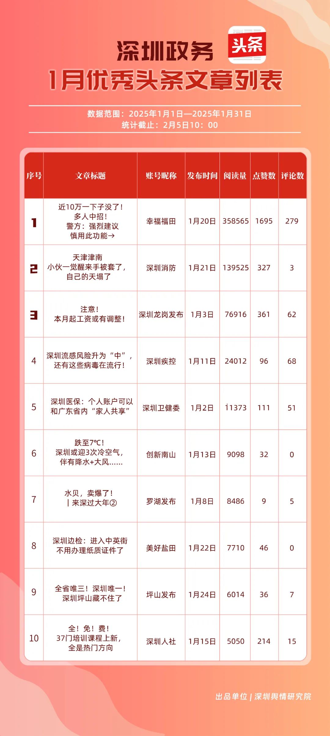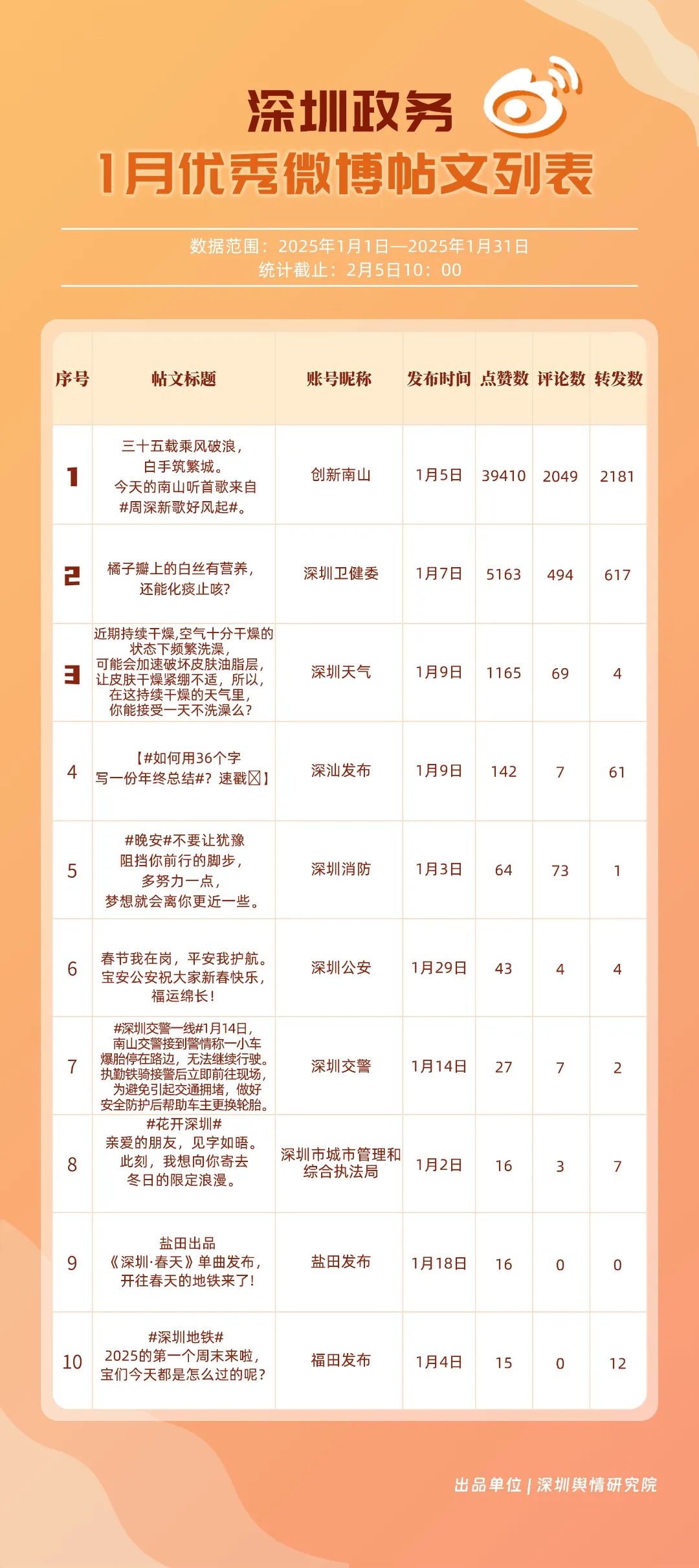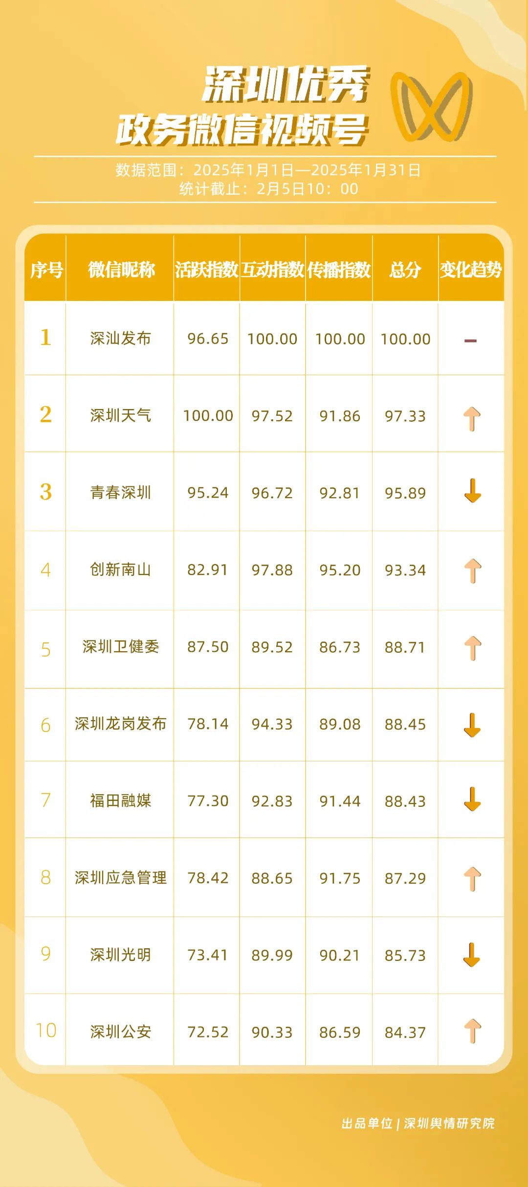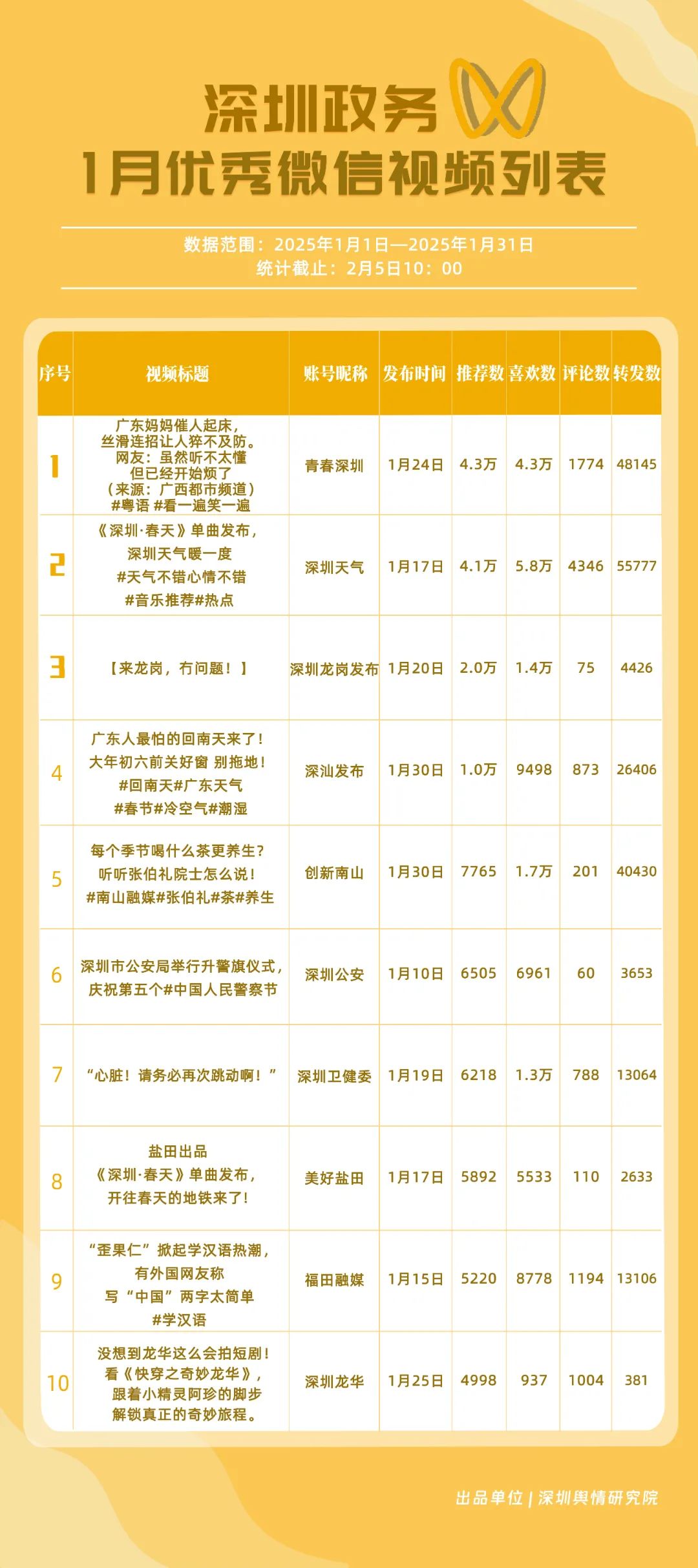 2025年1月期《深圳優(yōu)秀政務(wù)新媒體矩陣》發(fā)布,一同揭曉哪些政務(wù)新媒體矩陣能夠憑借其卓越表現(xiàn)脫穎而出,成為推動(dòng)政務(wù)信息傳播與服務(wù)模式創(chuàng)新的領(lǐng)航者,引領(lǐng)政務(wù)新媒體運(yùn)營邁向新高度。