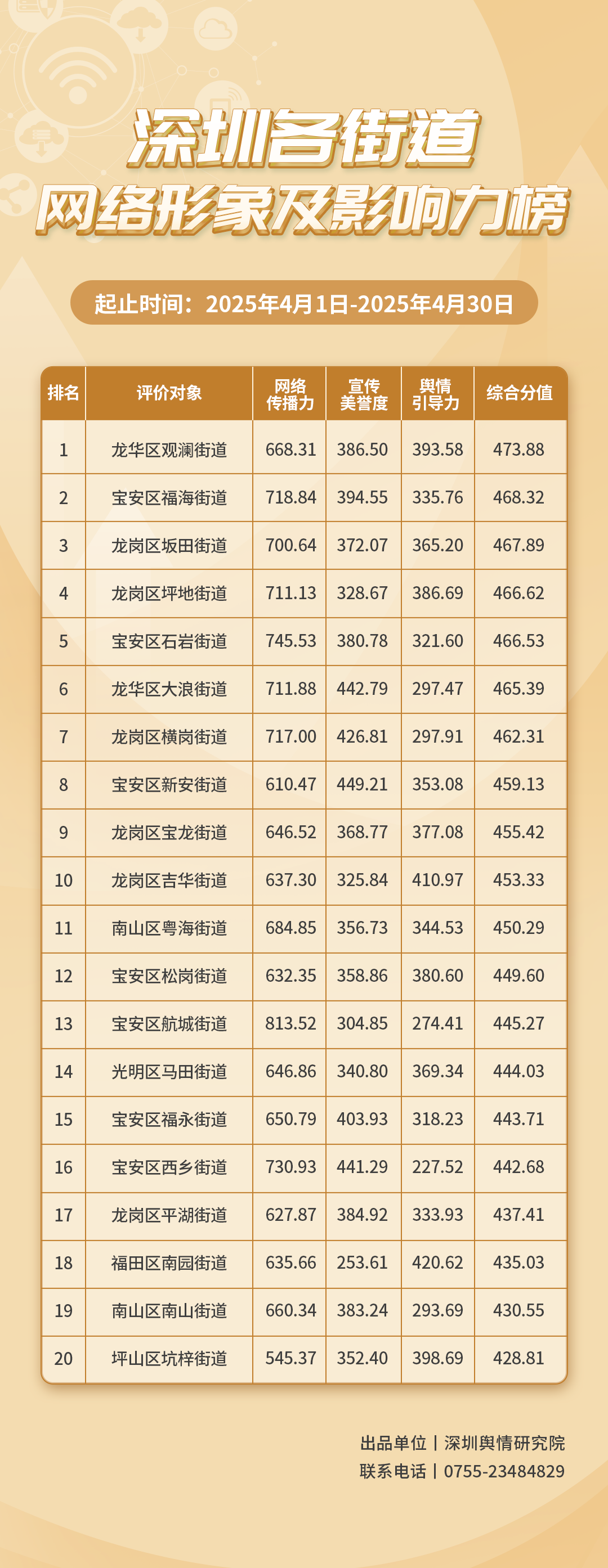 2025年4月,共有20個(gè)街道登上《深圳各街道網(wǎng)絡(luò)形象及影響力榜》,分別是:龍華區(qū)觀瀾街道、寶安區(qū)福海街道、龍崗區(qū)坂田街道、龍崗區(qū)坪地街道、寶安區(qū)石巖街道、龍華區(qū)大浪街道、龍崗區(qū)橫崗街道、寶安區(qū)新安街道、龍崗區(qū)寶龍街道、龍崗區(qū)吉華街道、南山區(qū)粵海街道、寶安區(qū)松崗街道、寶安區(qū)航城街道、光明區(qū)馬田街道、寶安區(qū)福永街道、寶安區(qū)西鄉(xiāng)街道、龍崗區(qū)平湖街道、福田區(qū)南園街道、南山區(qū)南山街道、坪山區(qū)坑梓街道。
