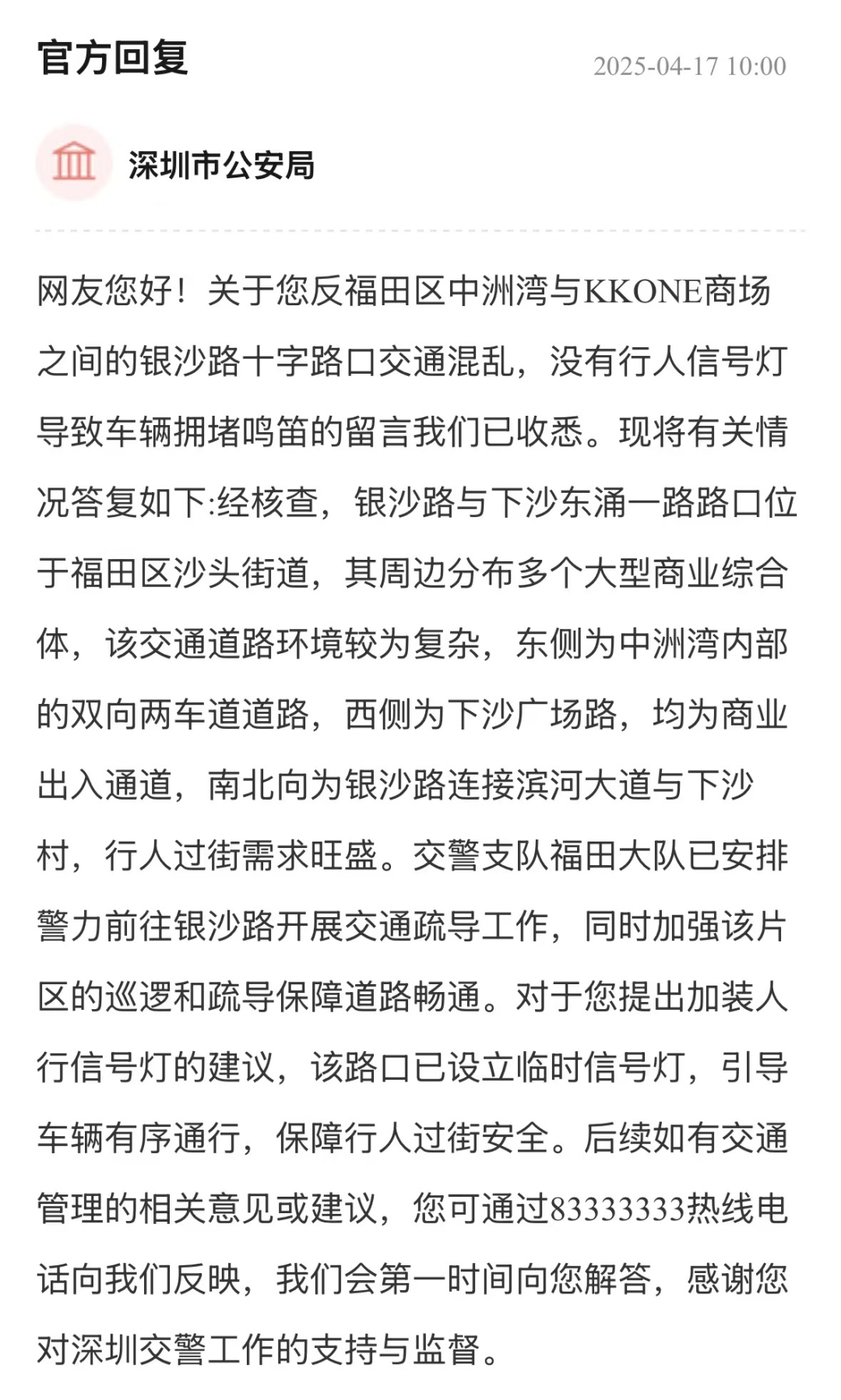 案例點評:商圈周邊商業(yè)密集、道路結構復雜,面對市民反映問題,市公安局交通警察局一方面安排警力現(xiàn)場疏導,另一方面根據實際情況,設立臨時信號燈,引導行人安全過街,車輛有序通行。雖未立即加裝固定信號燈,但該局以“應急處置、靈活調整”的務實方式解決燃眉之急,此類快速響應與因地制宜的處置模式,為商圈復雜路口交通管理提供范本。