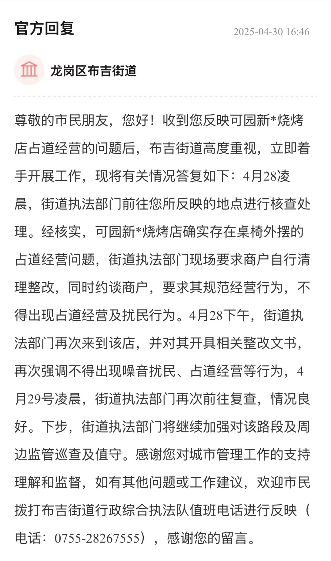 針對燒烤店占道經營與凌晨噪音擾民問題,街道辦行動迅速,回應中處置流程清晰。在現(xiàn)場核查確認違規(guī)事實后,街道辦開具整改文書,開展復查、加強周邊監(jiān)管,解決商業(yè)經營店鋪擾民問題,以規(guī)范行動守護居民“寧靜權”,展現(xiàn)了基層執(zhí)法的高效務實,切實提升了群眾生活幸福感。
