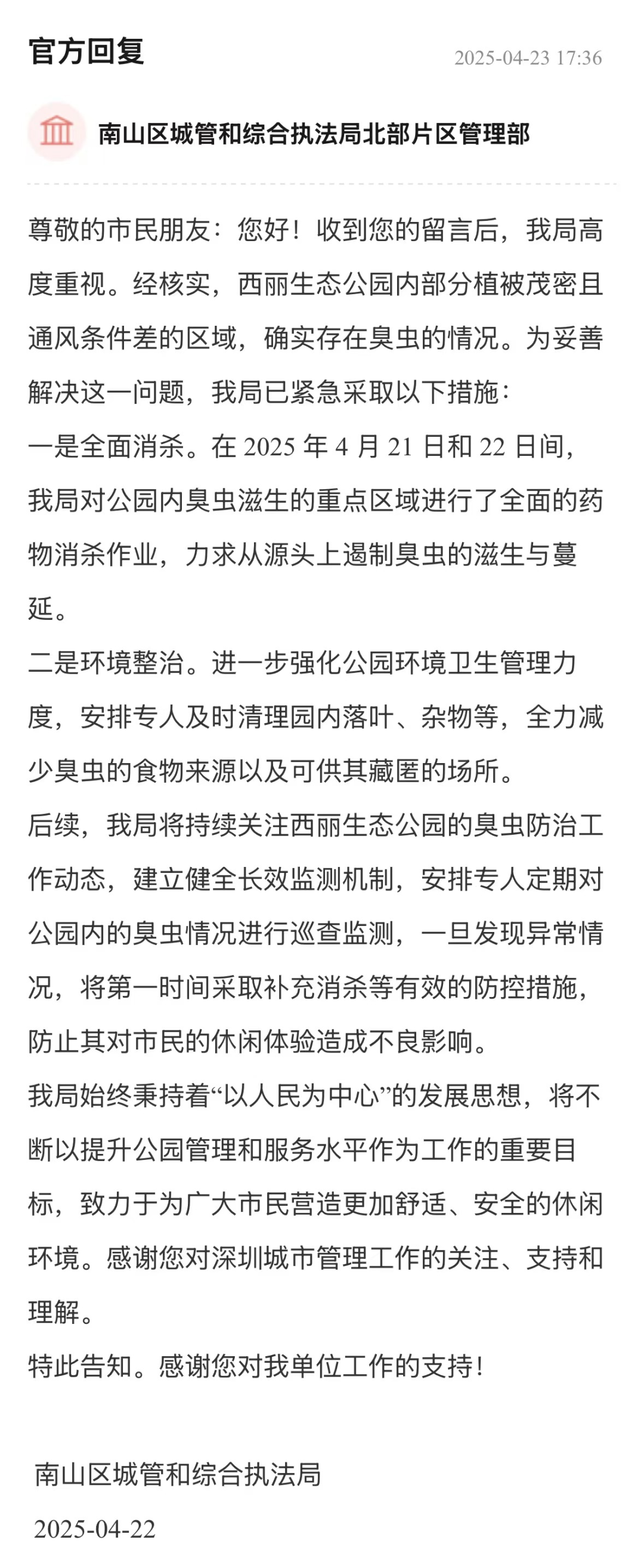 有市民反映南山區(qū)西麗生態(tài)公園臭蟲飛進附近住戶家中,急需消殺