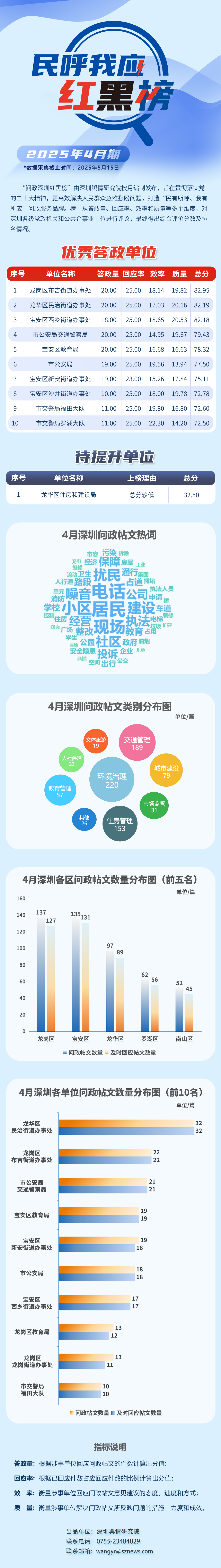 本期榜單采集的帖文主要來自深圳市及各區(qū)政府官網、深圳論壇、人民網領導留言板、深圳新聞網“民呼我應”等平臺,所采集帖文發(fā)布時間為2025年4月1日至4月30日,采集截止時間為2025年5月15日。