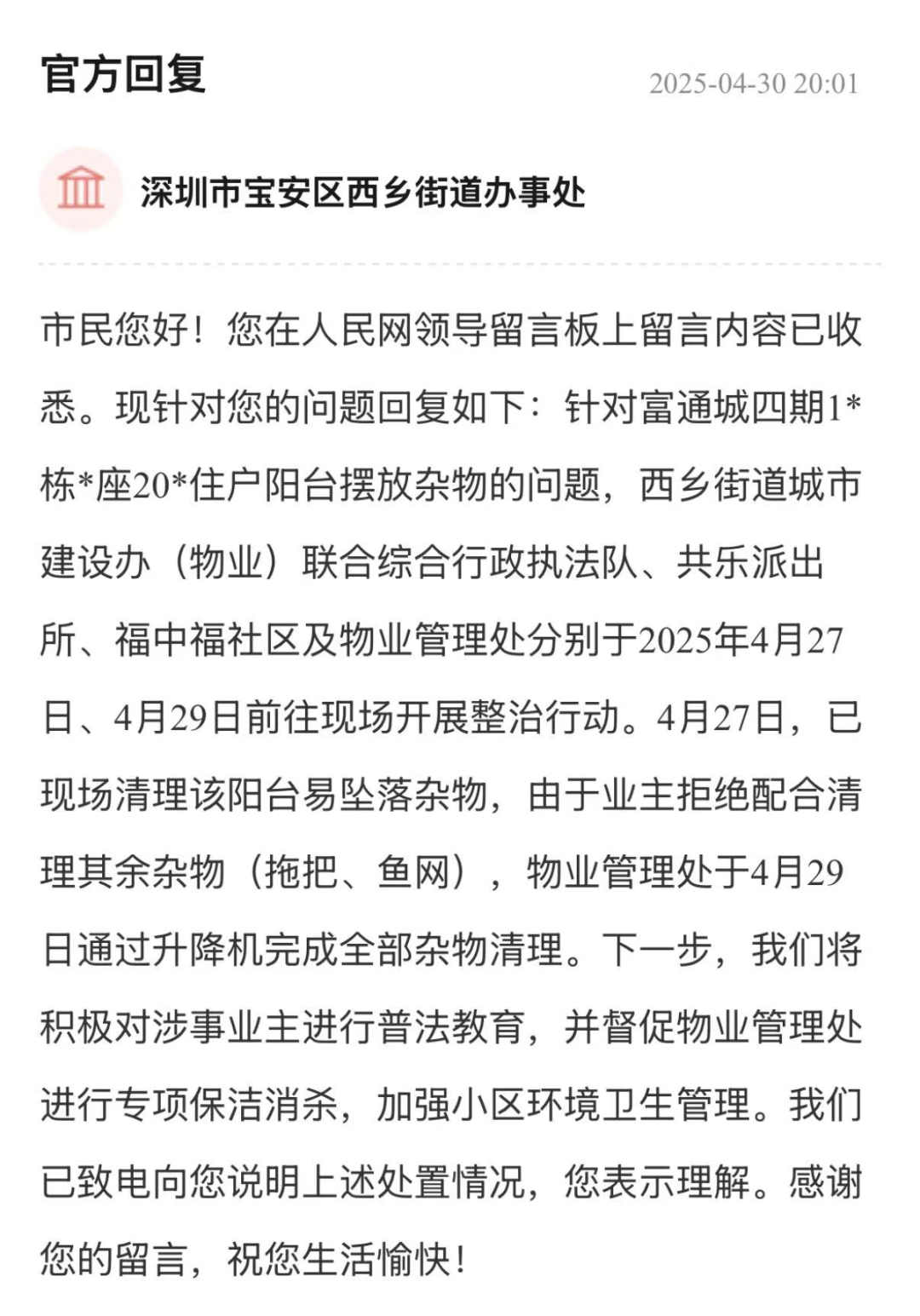 有市民反映寶安區(qū)西鄉(xiāng)街道富通城一住戶在陽臺懸掛雜物,嚴重影響居住環(huán)境
