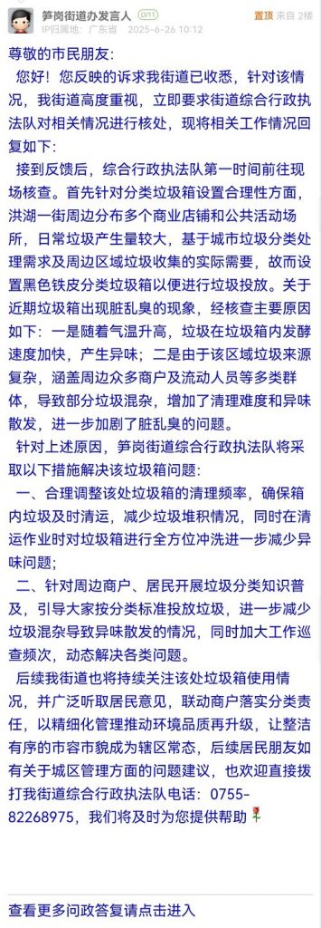 后續(xù)我街道也將持續(xù)關(guān)注該處垃圾箱使用情況,并廣泛聽取居民意見,聯(lián)動商戶落實(shí)分類責(zé)任,以精細(xì)化管理推動環(huán)境品質(zhì)再升級,讓整潔有序的市容市貌成為轄區(qū)常態(tài),后續(xù)居民朋友如有關(guān)于城區(qū)管理方面的問題建議,也歡迎直接撥打我街道綜合行政執(zhí)法隊電話:0755-82268975,我們將及時為您提供幫助!