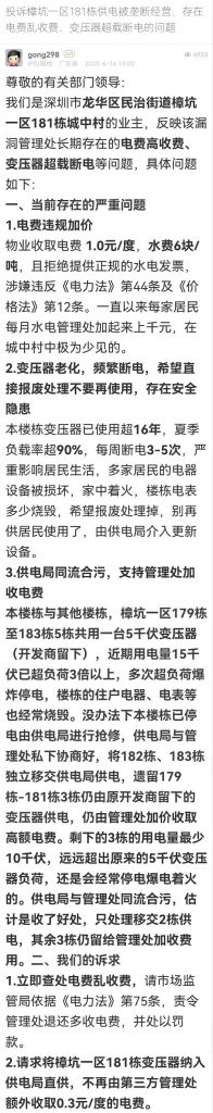 2. 帖文《投訴樟坑一區(qū)181棟供電被壟斷經(jīng)營,存在電費(fèi)亂收費(fèi)、變壓器超載斷電的問題》