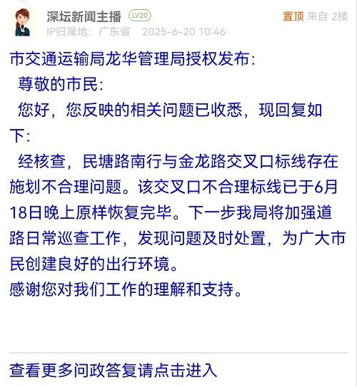 經(jīng)核查,民塘路南行與金龍路交叉口標(biāo)線存在施劃不合理問題。該交叉口不合理標(biāo)線已于6月18日晚上原樣恢復(fù)完畢。下一步我局將加強(qiáng)道路日常巡查工作,發(fā)現(xiàn)問題及時處置,為廣大市民創(chuàng)建良好的出行環(huán)境。