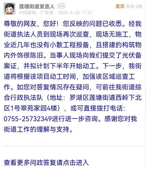 尊敬的網(wǎng)友,您好!您反映的問題已收悉。經(jīng)我街道執(zhí)法人員到現(xiàn)場再次巡查,現(xiàn)場無施工,物業(yè)近幾年也沒有小散工程報備,且搭建的構(gòu)筑物內(nèi)外飾很陳舊。當(dāng)事人現(xiàn)場向我們提交了光伏備案證,并擬計劃下半年開始動工。下一步,我街道將根據(jù)該項(xiàng)目動工時間,加強(qiáng)該區(qū)域巡查工作。如您對答復(fù)情況存在疑問,可前往我街道綜合行政執(zhí)法隊(地址:羅湖區(qū)蓮塘街道西嶺下北區(qū)1號翠苑家園4樓),或可直接撥打電話:0755-25732349進(jìn)行進(jìn)一步咨詢。感謝您對我街道工作的理解與支持。