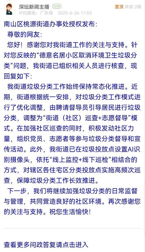 我街道垃圾分類工作始終保持常態(tài)化推進(jìn)。近期,街道根據(jù)統(tǒng)一安排,對垃圾分類工作模式進(jìn)行了優(yōu)化調(diào)整,由聘請督導(dǎo)員引導(dǎo)居民進(jìn)行垃圾分類,調(diào)整為“街道(社區(qū))巡查+志愿督導(dǎo)”模式。在加強(qiáng)社區(qū)巡查的同時,積極發(fā)動社區(qū)力量,組織黨員、志愿者等參與垃圾分類督導(dǎo)和宣傳活動。此外,我街道已在垃圾投放點(diǎn)設(shè)置AI識別攝像頭,依托“線上監(jiān)控+線下巡檢”相結(jié)合的方式,對轄區(qū)各住宅區(qū)分類投放點(diǎn)實(shí)施高頻次巡查,保障垃圾分類工作長效推進(jìn)。下一步,我們將繼續(xù)加強(qiáng)垃圾分類的日常監(jiān)督與管理,共同營造良好的社區(qū)環(huán)境。再次感謝您的關(guān)注與支持。祝您生活愉快!