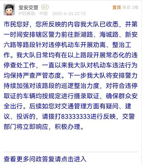 市民您好,您所反映的內(nèi)容我大隊已收悉,并第一時間安排轄區(qū)警力前往新湖路、海城路、新安六路等路段針對違停機(jī)動車開展勸離、整治工作。我大隊日常均有在以上路段開展常態(tài)化的違停查處工作,一直以來我大隊對機(jī)動車違法行為均保持嚴(yán)查嚴(yán)管態(tài)度。下一步我大隊將安排警力持續(xù)加強(qiáng)對該路段的巡邏整治力度,對符合違停取證的車輛均按規(guī)定進(jìn)行攝錄取證,確保群眾安全出行。后續(xù)如您對交通管理方面有疑問、建議、投訴的,請撥打83333333進(jìn)行反映,交警部門將立即響應(yīng),積極辦理。