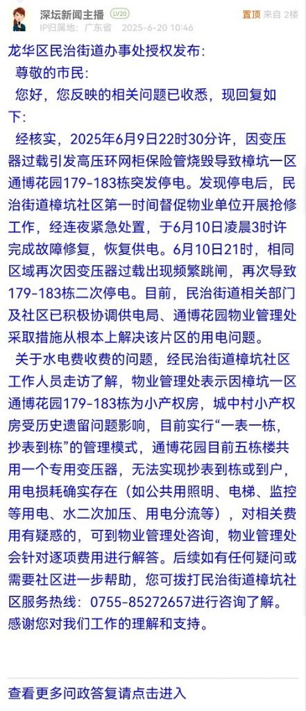 經(jīng)核實(shí),2025年6月9日22時30分許,因變壓器過載引發(fā)高壓環(huán)網(wǎng)柜保險管燒毀導(dǎo)致樟坑一區(qū)通博花園179-183棟突發(fā)停電。發(fā)現(xiàn)停電后,民治街道樟坑社區(qū)第一時間督促物業(yè)單位開展搶修工作,經(jīng)連夜緊急處置,于6月10日凌晨3時許完成故障修復(fù),恢復(fù)供電。6月10日21時,相同區(qū)域再次因變壓器過載出現(xiàn)頻繁跳閘,再次導(dǎo)致179-183棟二次停電。目前,民治街道相關(guān)部門及社區(qū)已積極協(xié)調(diào)供電局、通博花園物業(yè)管理處采取措施從根本上解決該片區(qū)的用電問題。