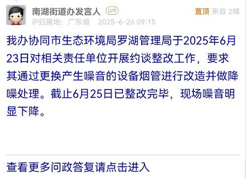我辦協(xié)同市生態(tài)環(huán)境局羅湖管理局于2025年6月23日對相關(guān)責(zé)任單位開展約談?wù)墓ぷ?,要求其通過更換產(chǎn)生噪音的設(shè)備煙管進(jìn)行改造并做降噪處理。截止6月25日已整改完畢,現(xiàn)場噪音明顯下降。