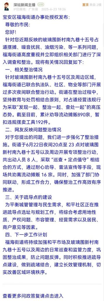 尊敬的市民:您好!針對您近期反映的玻璃圍新村南九巷十五號占道擺攤、噪音擾民、油煙污染、等一系列問題,福海街道高度重視并立即組織相關(guān)部門進(jìn)行了深入調(diào)查和整治。現(xiàn)將有關(guān)情況回復(fù)如下:
