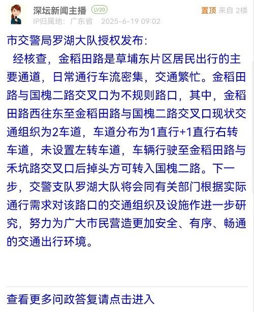 經(jīng)核查,金稻田路是草埔東片區(qū)居民出行的主要通道,日常通行車流密集,交通繁忙。金稻田路與國槐二路交叉口為不規(guī)則路口,其中,金稻田路西往東至金稻田路與國槐二路交叉口現(xiàn)狀交通組織為2車道,車道分布為1直行+1直行右轉(zhuǎn)車道,未設(shè)置左轉(zhuǎn)車道,車輛行駛至金稻田路與禾坑路交叉口后掉頭方可轉(zhuǎn)入國槐二路。下一步,交警支隊羅湖大隊將會同有關(guān)部門根據(jù)實(shí)際通行需求對該路口的交通組織及設(shè)施作進(jìn)一步研究,努力為廣大市民營造更加安全、有序、暢通的交通出行環(huán)境。
