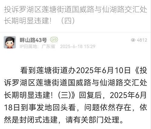 15. 帖文《投訴羅湖區(qū)蓮塘街道國威路與仙湖路交匯處長期明顯違建?。ㄋ模?/a>》