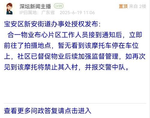 合一物業(yè)布心片區(qū)工作人員接到通知后,立即前往了拍攝地點(diǎn),暫無看到該摩托車停在車位上,社區(qū)已督促物業(yè)后續(xù)加強(qiáng)監(jiān)督管理,如再次見到該摩托將禁止其入村,并報交警中隊。