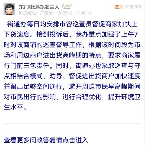 街道辦每日均安排市容巡查員督促商家加快上下貨速度。接到投訴后,我辦重點(diǎn)加強(qiáng)了上午7時對該商鋪的巡查督導(dǎo)工作,根據(jù)該時間段為市場和周邊商戶進(jìn)出貨高峰期的特點(diǎn),要求商家履行門前三包責(zé)任。同時,街道辦也采取巡查與守點(diǎn)相結(jié)合模式,勸導(dǎo)、督促進(jìn)出貨商戶加快速度并留出足夠空間通行,避開周邊市民早高峰期間對市民出行的影響,進(jìn)行合理優(yōu)化,提升環(huán)境衛(wèi)生水平。